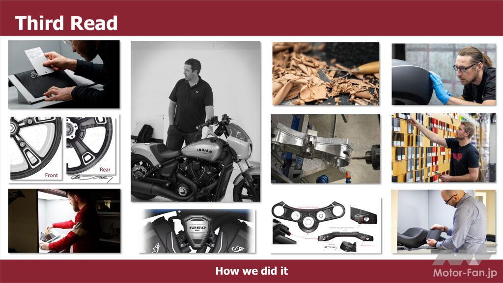 まずエンジンは完全に新設計。クレイモデルを削って細部まで美しさを追求しクリーンに仕上げた。これをベースに車体のデザインへ移行。離れたところから見た第一印象を大切にし、一目でスカウトであることがわかる「それらしい」デザインにこだわった。タンクからのなだらかなラインは往年のスカウトをモチーフにし、それは他のモデルにも生かされている。またクレイを使って手作業で仕上げていく古典的手法を大切にした。CAD頼りよりプロトタイプを前に肌で実物を感じながら丁寧に仕上げていくことを大切にしたそう。
