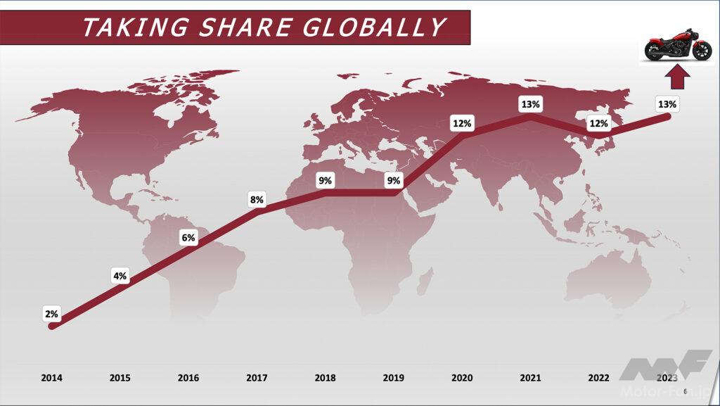 まずGRANT BESTER氏は、2011年にポラリスインダストリーズがインディアンブランドを買収し、オリジナルモデルをリリースしてから10年、右肩上がりのシェア拡大を続ける同ブランドの業績を披露。ユーザーはグローバル市場で今や20万人を超え、85カ国に600店を超えるディーラー網を構築。生産工場はアメリカ本国だけではなく、アジア(ベトナム)とヨーロッパ(ポーランド)にも設けられアメリカ以外での販売が40%に及ぶそう。オーナーイベントも積極的に開催され、カスタムを楽しむ人気にも支えられ、過去5年間で事業規模は倍に膨らんだ。こうした成長の牽引力となったのは、スカウトの人気が大きかった。特にアメリカ以外での人気は同ブランドの50%に及ぶと言う。