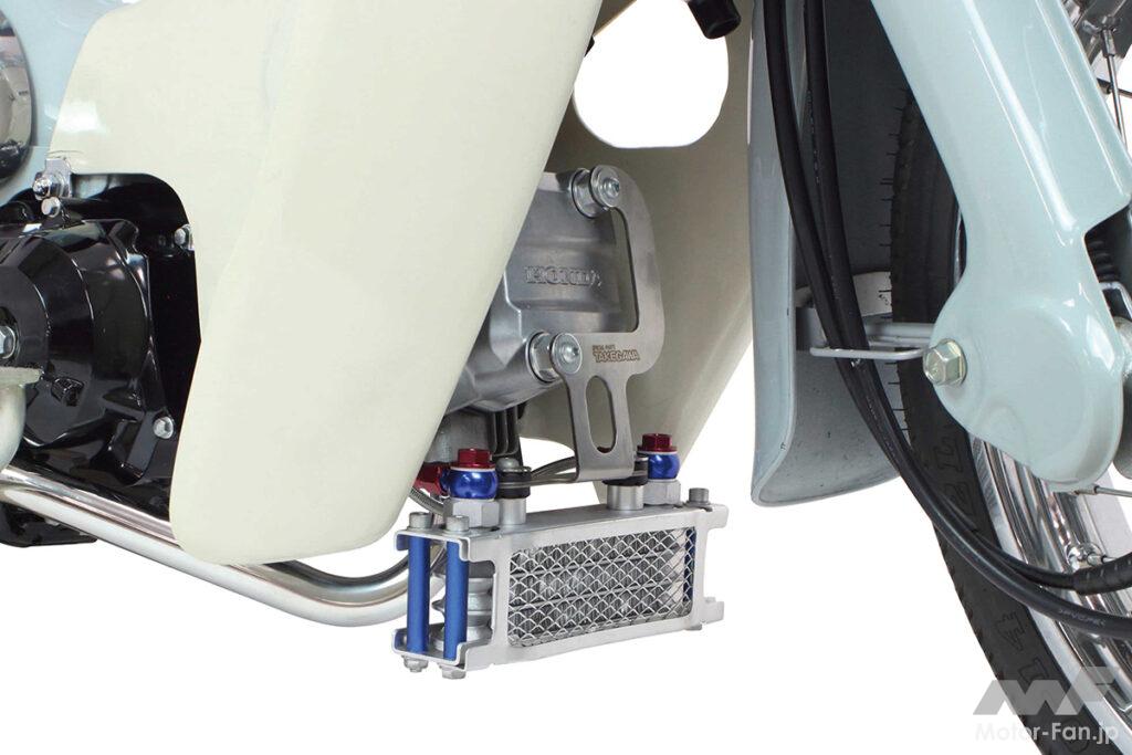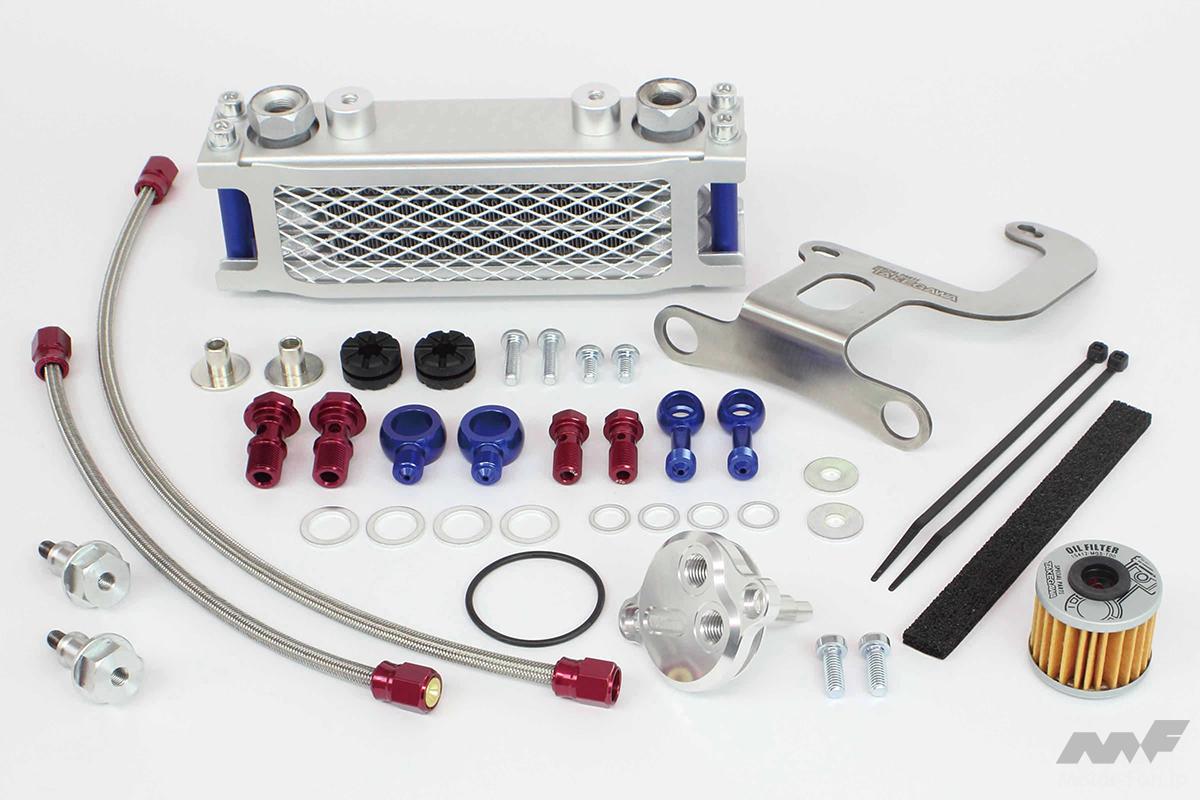 スペシャルパーツ武川製Sステージ/Rステージボアアップキット装着車専用のオイルクーラーキット。オイルクーラー本体はボアアップシリンダーに接続するタイプ。オイル取出し用ボス付き。オイルクーラープレートと専用ガードも標準装備。