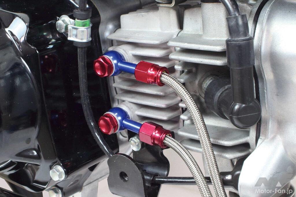 オイルクーラー本体は冷却効果に優れたコンパクトクールを採用。ノーマルのシリンダーヘッドカバーにキット付属のオイルクーラーステーを装着し、オイルクーラー本体を固定する。レッグカバーとノーマルエアクリーナーボックスを装着したままでも取り付けOKだ。