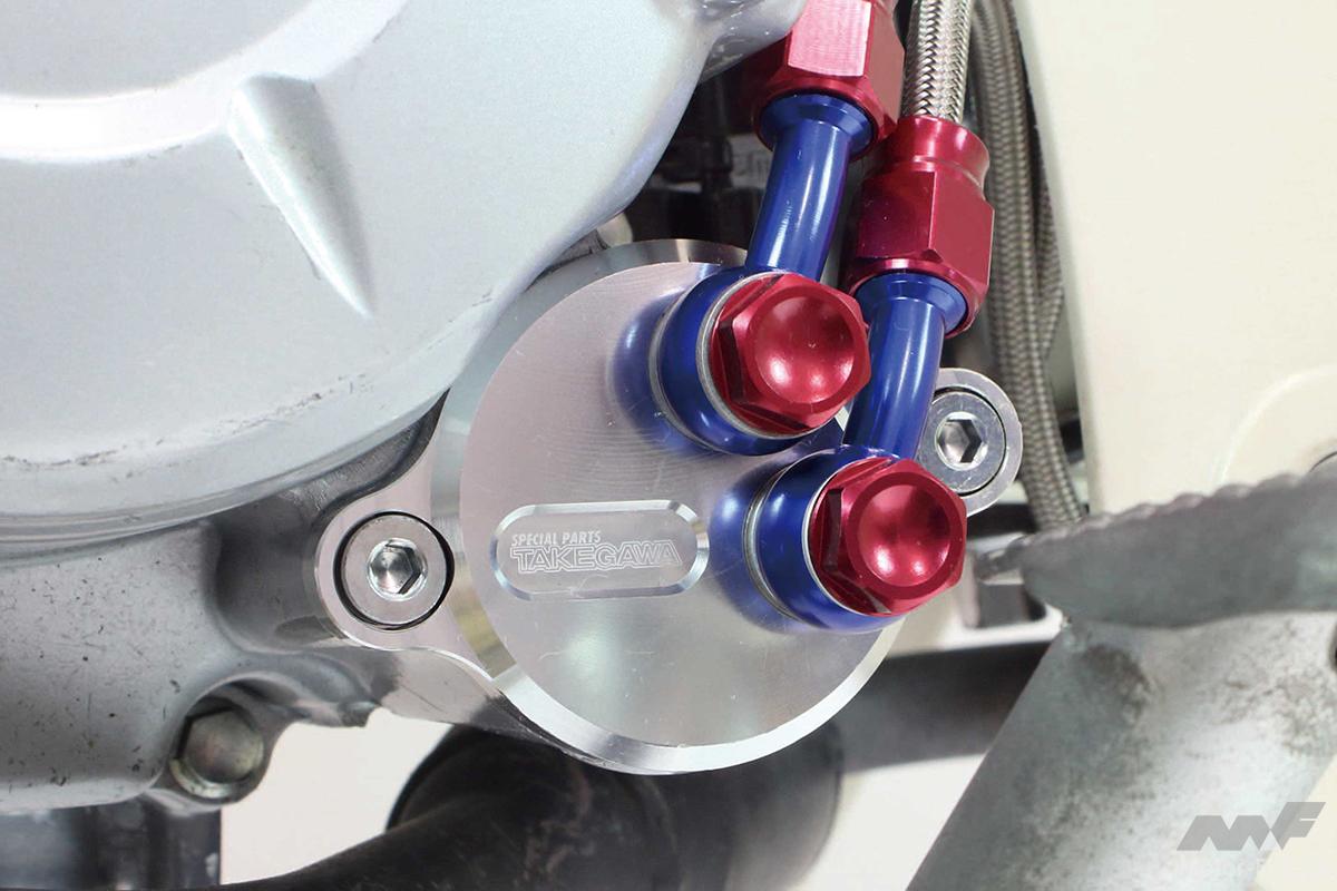 ノーマルクラッチカバーにあるオイルフィルター部に、キット付属のオイルクーラーユニットを装着することで、オイルクーラーへのオイル取り出しが行える。オイルクーラーユニット装着時でも使用可能な専用オイルフィルターが付属しているため、オイルフィルター機能を損なうことなくエンジンオイルの取り出しOK。