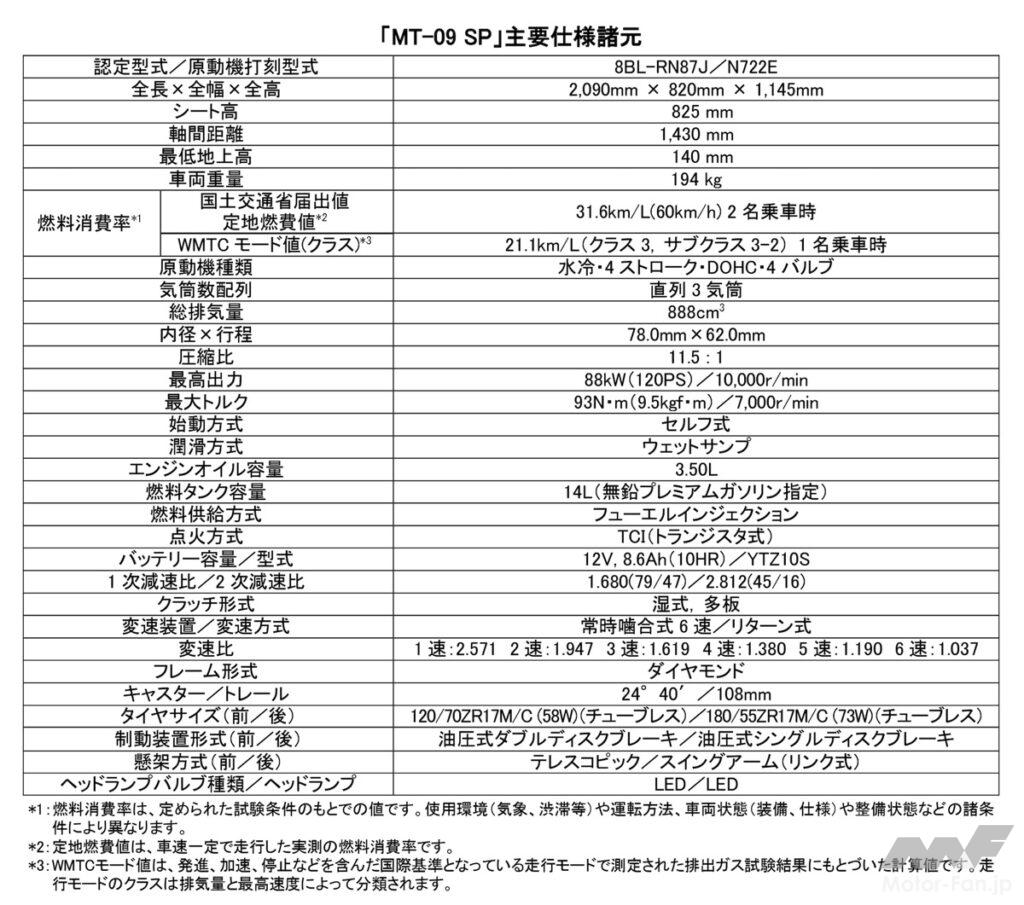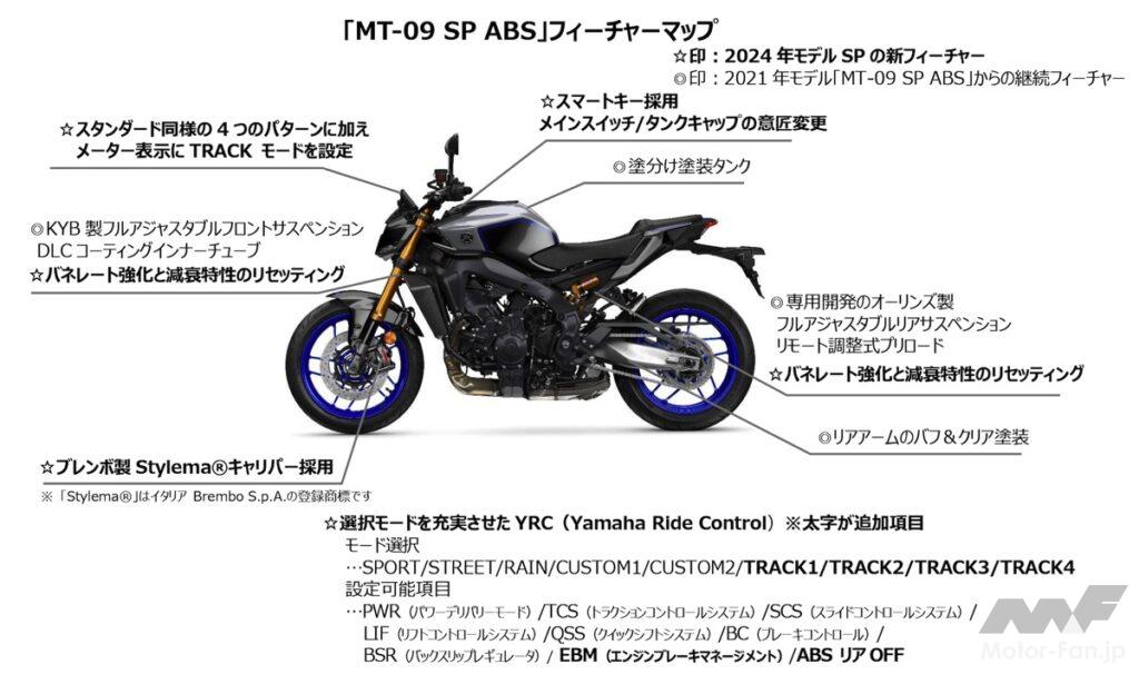 「MT-09 SP」は、「MT-09」の上級仕様車で、より豪華なパーツが奢られ走行性能も強化されているグレードとなる。