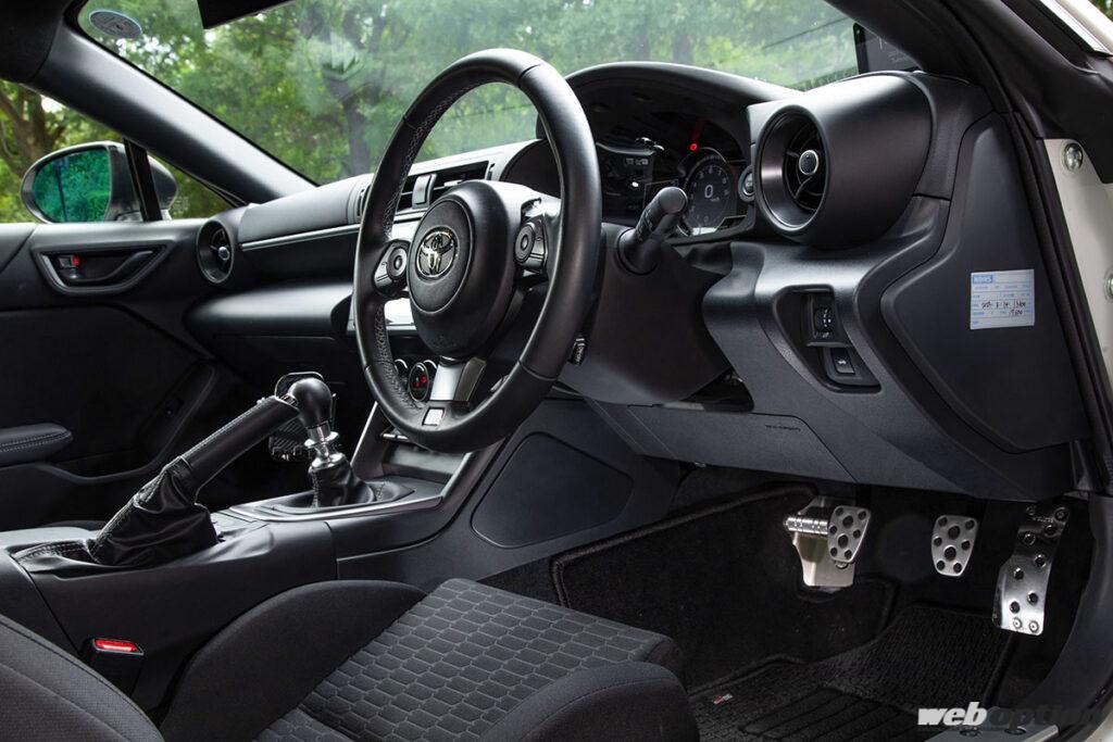 インテリアは、各種ペダル類やスペーサーの装着でヒール&トゥがしやすいようにセットアップ。アルミ削り出しのリバースギヤトリガーも、高品位なスポーティさを演出する。