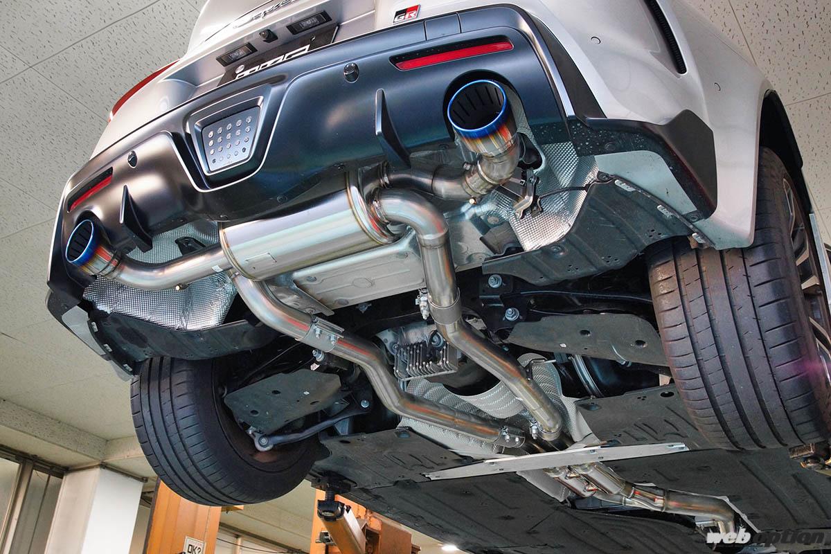 メインパイプ径は74.7φ→60φ×2→70φ×2、テール外形は110φ×2というレイアウト。絞り無しのフルストレート構造を採用しつつも、各部にHKS独自の技術を盛り込むことで、厳しい国内騒音基準をクリアしている。