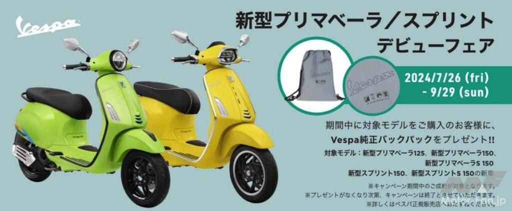 ピアッジオグループジャパンは、新型となった「プリマベーラ/スプリント」の発売を記念したデビューフェアを開催する。ベスパ純正品扱いのバックパックをプレゼントする。対象車種は「プリマベーラ125/125」「プリマベーラS 150」「スプリント150」「スプリントS 150」。期間は2024年7月26日(金)〜9月29日(日)まで。
