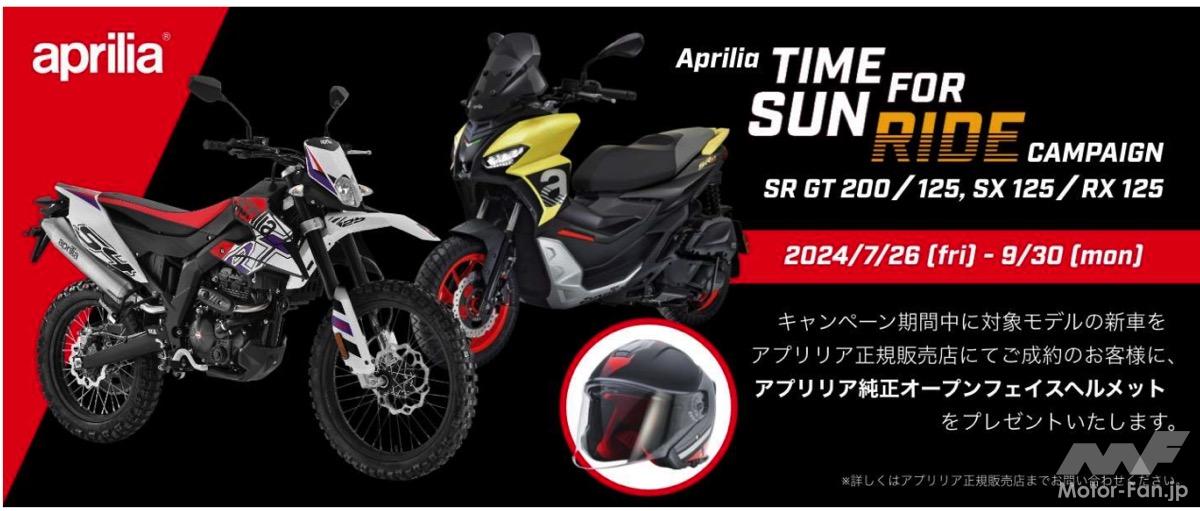 ピアッジオグループジャパンは、ピアッジオのスクーター「SR GT 200/125」と、オフロード「RX125」の購入者に、同社純正品扱いのヘルメットをプレゼントする。期間は2024年7月26日(金)〜9月30日(月)まで。ヘルメットはオープンフェイス(ジェット)タイプのもの。赤・黒・白のアプリリアカラーが纏われたもので、マットカラーとなっている。