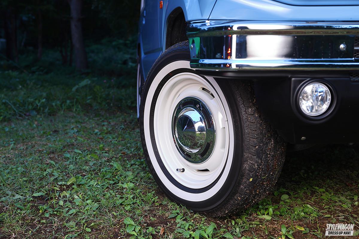 「たくさんある青の見本色からチャイナブルーに辿り着くまでにかなりの時間を要しました」とは青々さん。そんなブルー×ホワイトのツートンに加えて、DAMDザ・ルーツのバンパーをメッキ加工するなど、クラシカルな佇まいが魅力的。さらにホイールはディーンクロスカントリー、タイヤはマッドではなくヨコハマのラジアルを履くなど、オールドスクールなモノ選びがなんともクールです。
