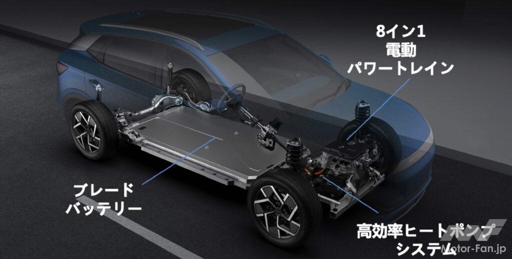 バッテリーには三元系(ニッケルコバルトマンガン酸)リチウムイオン電池より低コストで安全性の高いリン酸鉄リチウムイオン電池を搭載。単セルのエネルギー密度が劣る分は、板状にした“ブレードバッテリー”をモジュール化せずにスタッキングすることでカバーし、バッテリーパック全体のエネルギー密度を三元系同等まで引き上げた。