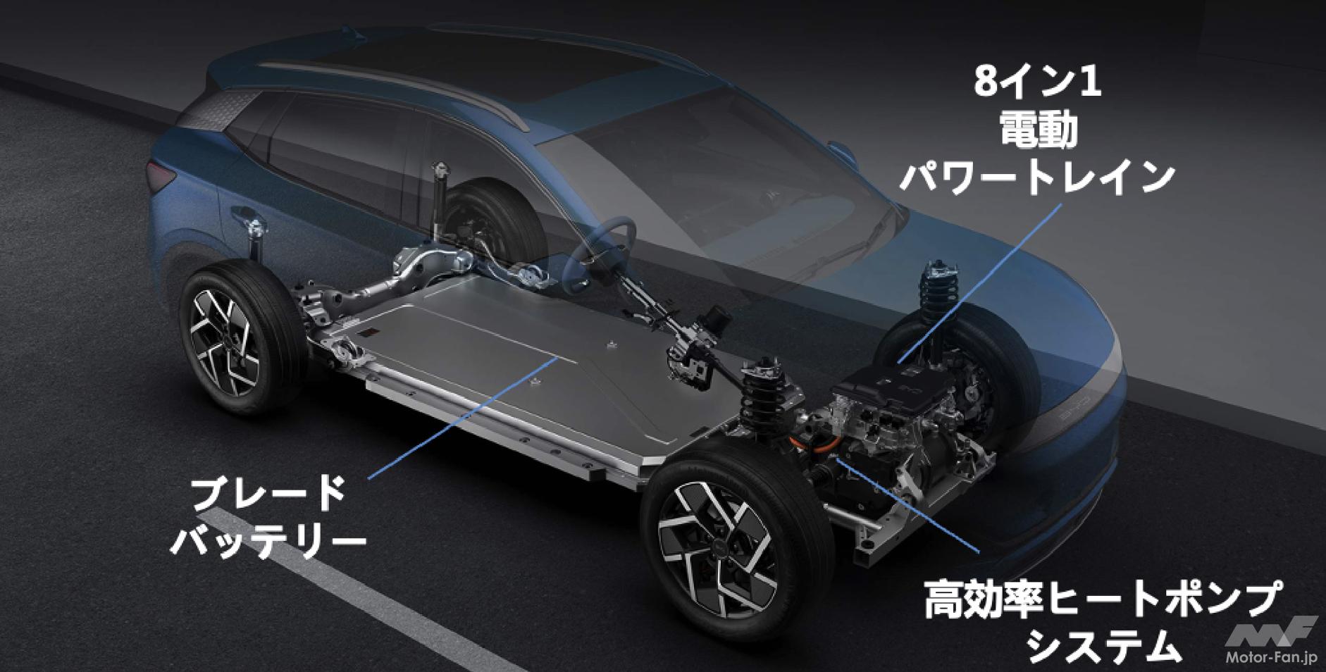 バッテリーには三元系(ニッケルコバルトマンガン酸)リチウムイオン電池より低コストで安全性の高いリン酸鉄リチウムイオン電池を搭載。単セルのエネルギー密度が劣る分は、板状にした“ブレードバッテリー”をモジュール化せずにスタッキングすることでカバーし、バッテリーパック全体のエネルギー密度を三元系同等まで引き上げた。
