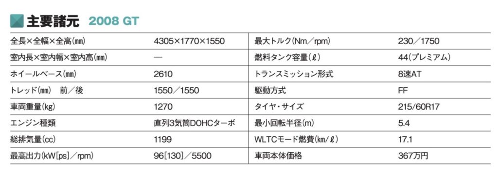 Bセグメントのコンパクトカーはフランス車が最も得意とするところで2008でもデザイン、上質な乗り味ともに世界のベンチマークと言える存在だ。パワートレインは1・2lガソリンターボ、1・5lディーゼルターボ、BEV(電気自動車)と3種類用意され、ユーザーの好みやライフスタイルに合わせて選択できるようになっている。