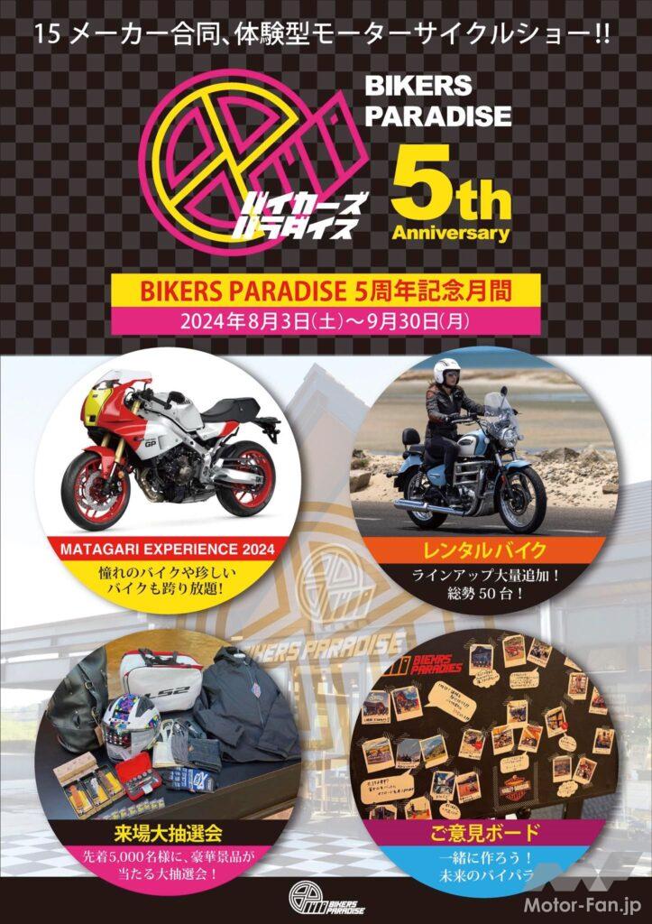 そのほか、先着5,000名に豪華景品が当たる大抽選会、お客様と共に未来のバイカーズパラダイスを作るメッセージボードコーナーを設置。期間中はメディアによる撮影会やトークショーなど多数のイベントも開催される。