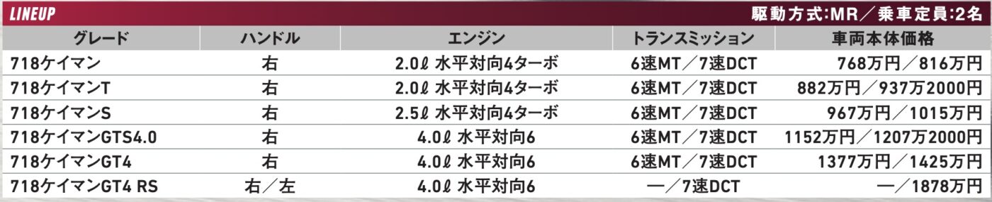 4気筒ターボになりはしたが、スペックや加速性能は向上していたためケイマンらしいスポーティなフットワークを楽しむことができたが、やはり911に比べるとエンジンサウンドや吹け上がりに少し雑味が感じられた。だが、そういった声が世界各地で上がり始めると、ポルシェはすぐに考えを改め、ケイマンに4.0l自然吸気の6気筒を搭載したGTSやGT4といった上位グレードを設定。さらに昨年は500psを発揮する、GT4RSまで発売し、ラインナップを拡充した。