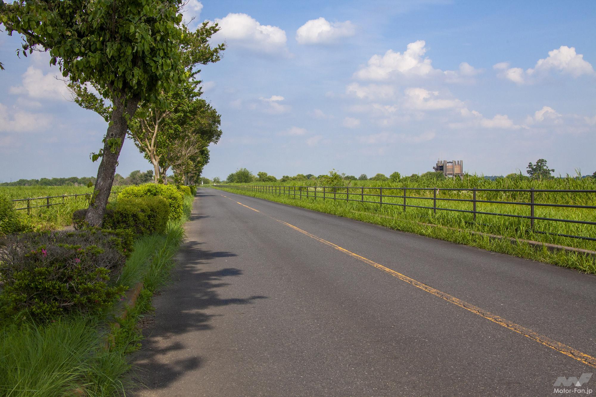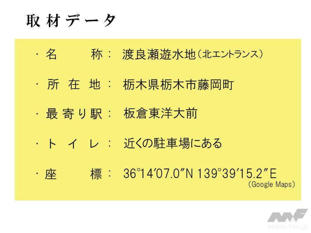 今回の座標ポイントは「渡良瀬遊水地」の北エントランスを示している。車やバイクで訪れるにはここからがお勧め。県道9号から遊水地へのアプローチ路へ進入すると、すぐ右手に駐車場が見つかり、そこには公共トイレや多目的広場に子供広場ゾーン、奥には谷中湖展望台がある。