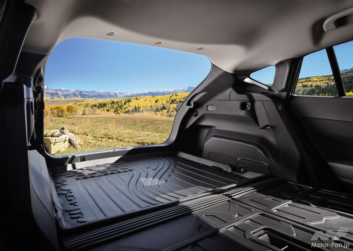 エントリーモデルのインテリアには、7.0インチのデュアルディスプレイが搭載されている。上画面では、ワイヤレスのApple CarPlay/Android Autoによるスマートフォン連携に加えて、Bluetoothハンズフリー通話およびオーディオストリーミング接続などの操作が可能。下画面には、気候や車両設定のコントロールが配置されている。その他、標準装備には、フロントシートにUSB-Aポート、60:40分割可倒式リアシート、カーペット入りフロアマット、クロスバーマウントポイント、カラーLCD付きコンビネーションメーター、ウェルカムライト、カーゴトレイなどが含まれている。