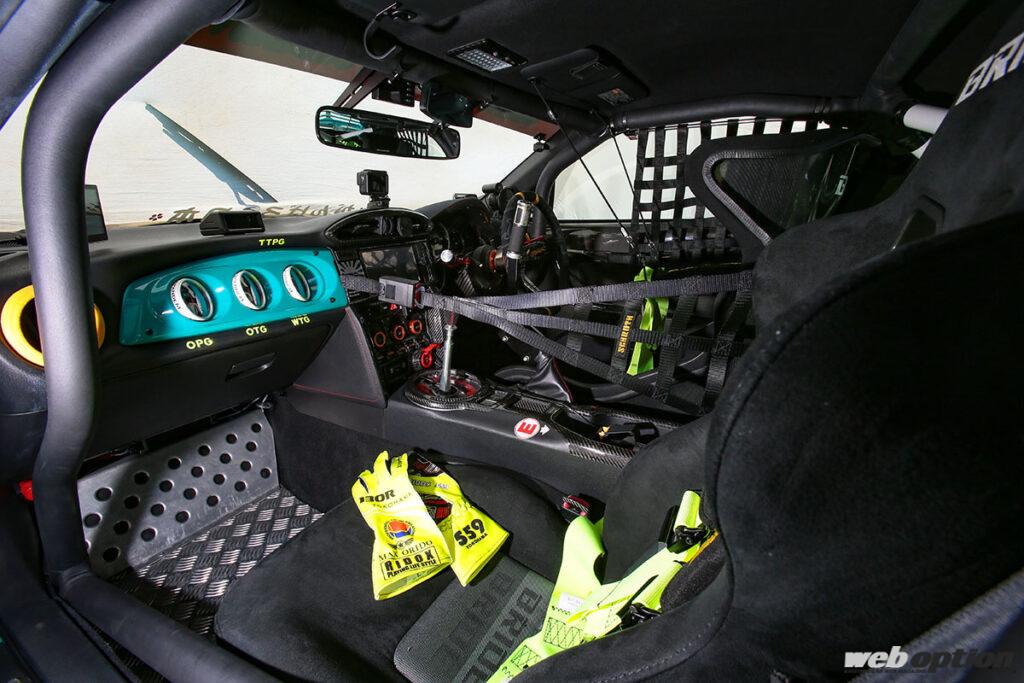 また、ウインドウネットやヘッドガードを備えたシート(運転席:ブリッドセロRS/助手席:ブリッドユーロスターII)、ネオンカラーのレーシングハーネスを吊り下げるなど、レーシーさもしっかり底上げする。