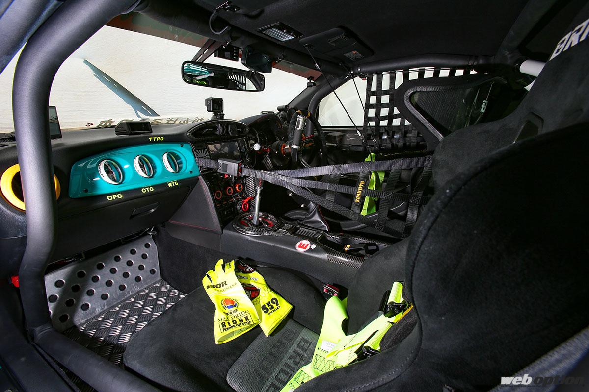 また、ウインドウネットやヘッドガードを備えたシート(運転席:ブリッドセロRS/助手席:ブリッドユーロスターII)、ネオンカラーのレーシングハーネスを吊り下げるなど、レーシーさもしっかり底上げする。