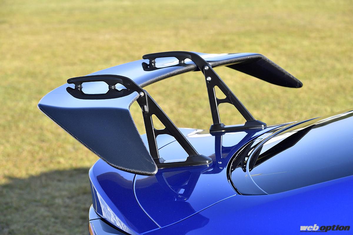 車高調はアラゴスタベースのオリジナル(F16kg/mm R18kg/mm+ヘルパー3kg/mm)で、クスコの調整式アームとブッシュ類のピロボール化も図られている。ブレーキは前後ともにエンドレスのモノブロックタイプを装着。