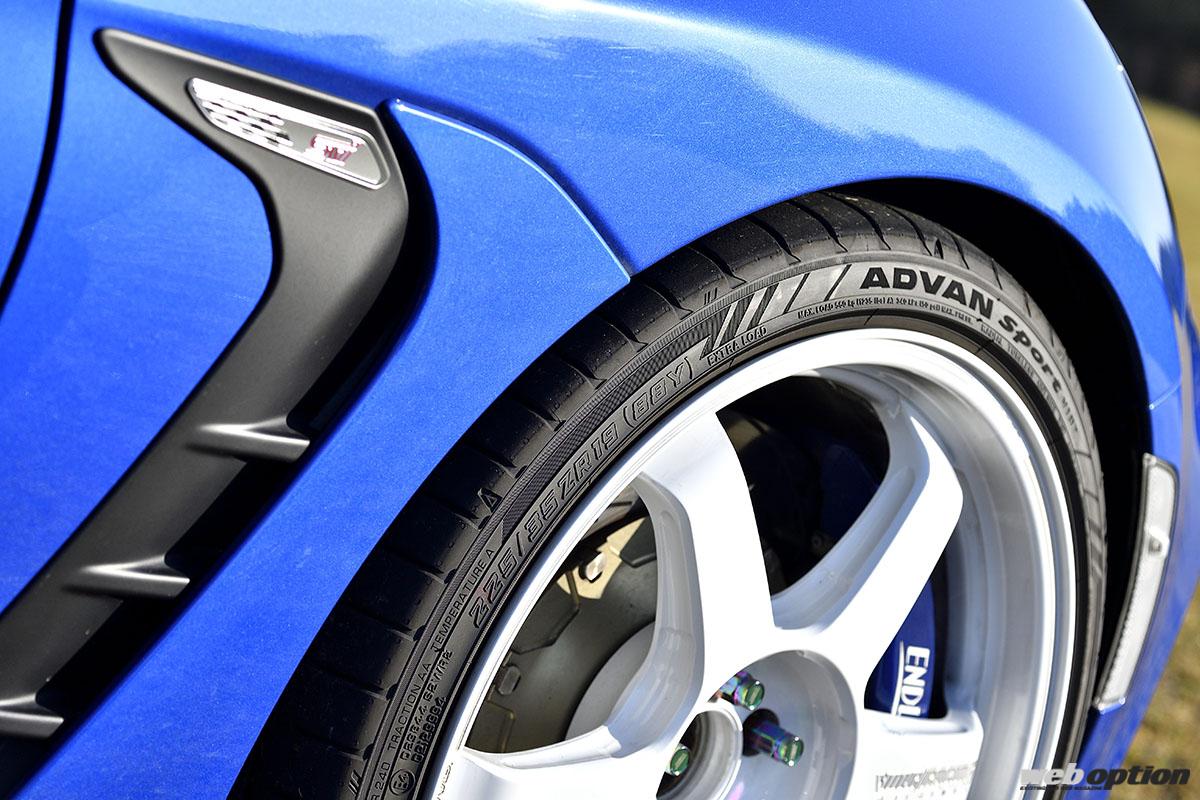 ボルクレーシングTE37ウルトラトラックエディションII(FR8.5J+45)に225/35-19サイズのアドバンスポーツの組み合わせも前回同様。ただし、ファイナルギヤだけは大幅なパワーアップに伴ってNAチューン時代の4.5から3.7(純正は4.1)へとハイギヤード化し、トップエンドの伸びに磨きをかけている。