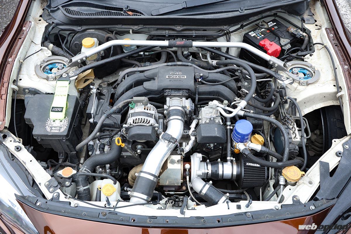 エンジン本体はノーマルのまま、トラストのT518Zボルトオンターボキットを装着。ECUを現車合わせすることで、ブースト圧0.8キロ時に約280psを発生させている。かなりギリギリのセッティングだが、エンジンよりも駆動系の方が先に壊れるという(累計ドライブシャフト折れ5本!)。