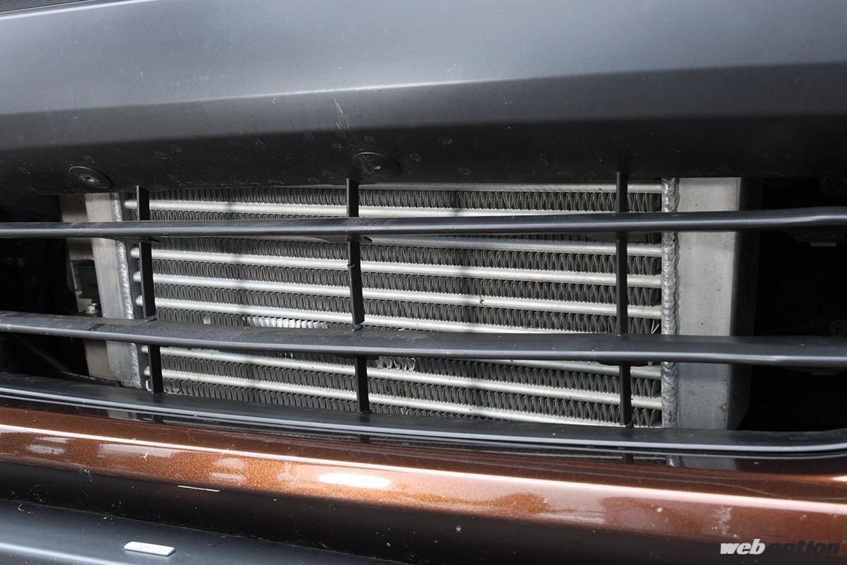前置きインタークーラーの奥にはドリフト必須パーツのエンジンオイルクーラーを追加。「ターボ化して高負荷が続くドリフト走行を行うとすぐに油温が上がるので、エンジンを守るためにもオイルクーラーの追加は絶対ですね」とみっつさん。