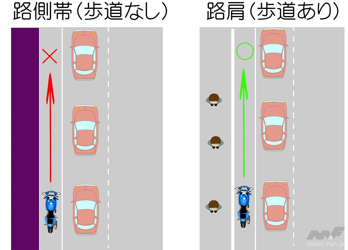 「歩道が別途設けられた道路の、白線の外側」は、路肩と呼ばれ、道交法ではバイクの走行が禁止されていない(四輪車は不可)。ただし、「左側追越し禁止」の原則に違反する可能性もあるので、取り締まる警察官によっては、取り締まりの対象となる場合もある。
