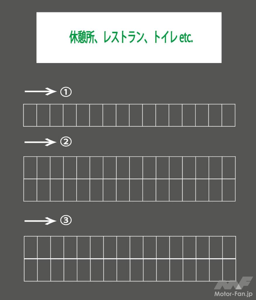 以上の傾向とリサーチから、混雑時にもっとも駐車スペースを見つけやすいのは、②>③>①の順(あくまでも編集部の調査による結果。日時や渋滞状況等により異なる場合あり)。渋滞時や混雑時にサービスエリア(SA)やパーキングエリア(PA)を利用する際は、ぜひともお試しあれ!