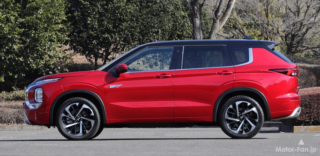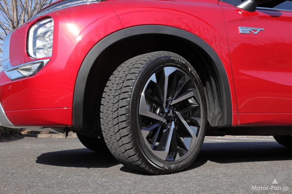 フロントとリヤに高出力のモーターを搭載した「ツインモーター4WD」なのもアウトランダーPHEVの大きな特徴。床下に搭載するリチウムイオンバッテリーの総電力量は20kWhで、電気自動車のeKクロスEVと同じである。つまり大容量。そのため、充分なEV航続距離(WLTCモードのEV走行換算距離で83〜87km)を確保している。