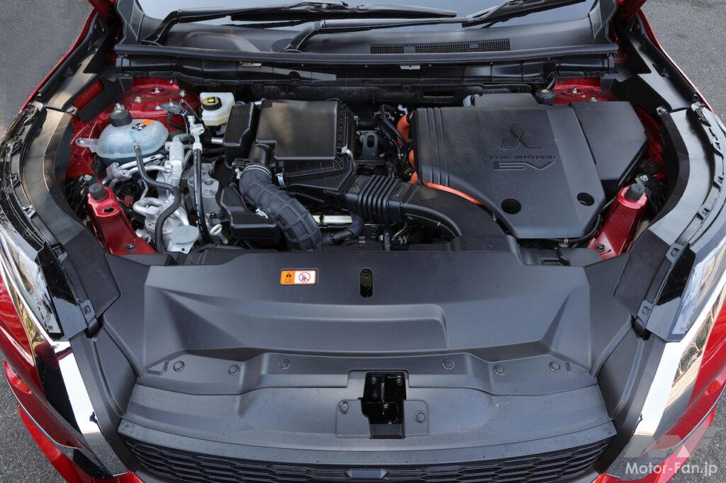 横置き(左右方向)に搭載する2.4L直列4気筒自然吸気エンジンの横に搭載するフロントモーターの最高出力は85kW、最大トルクは255Nmだ。リヤモーターの最高出力は100kW、最大トルクは195Nmである。昨今、リヤに高出力モーターを搭載する電気式4WDが増えているが、高出力といえどもアウトランダーPHEVほど高出力ではなく、フロントに搭載するパワーユニットのほうが高出力なのが一般的だ。