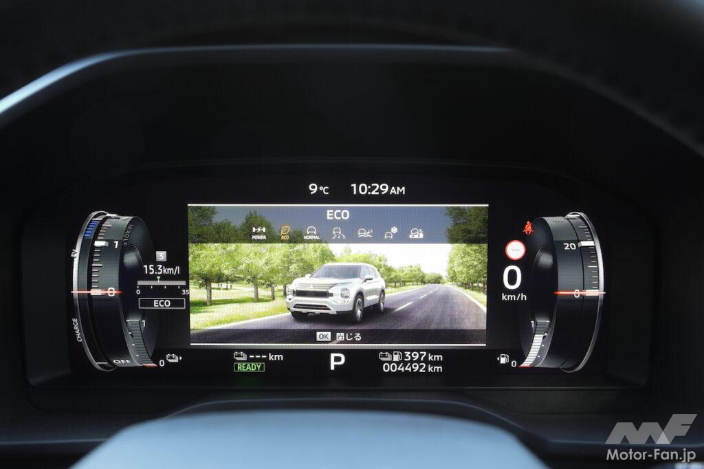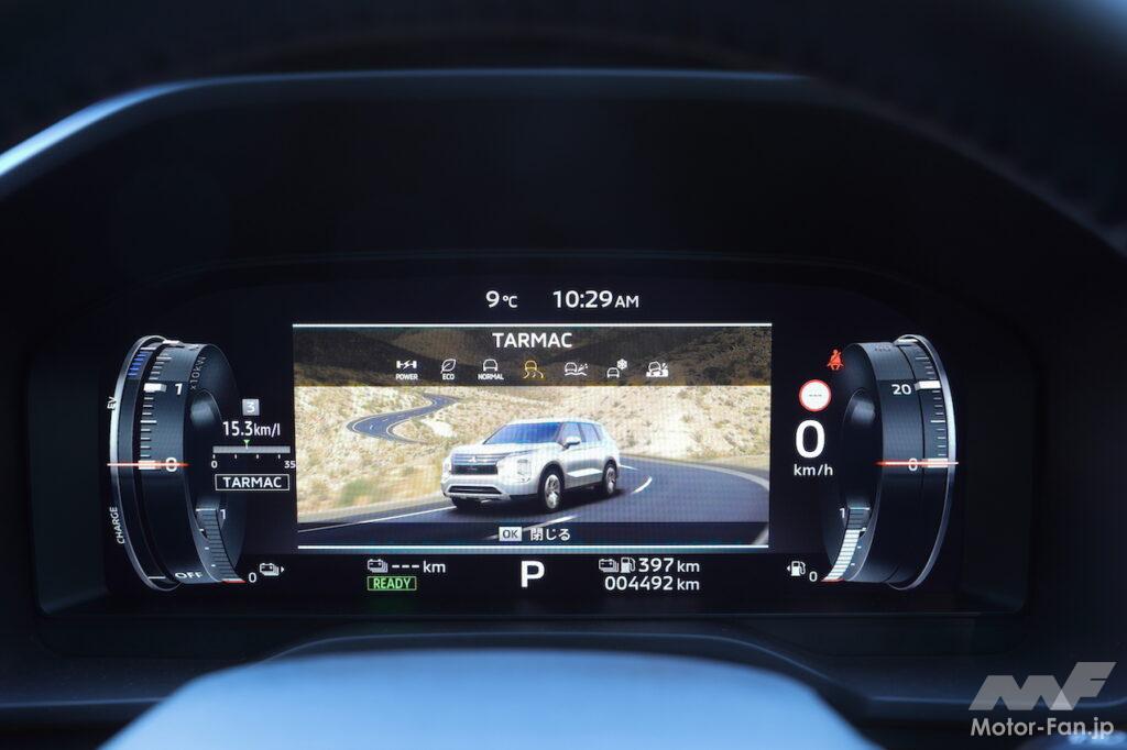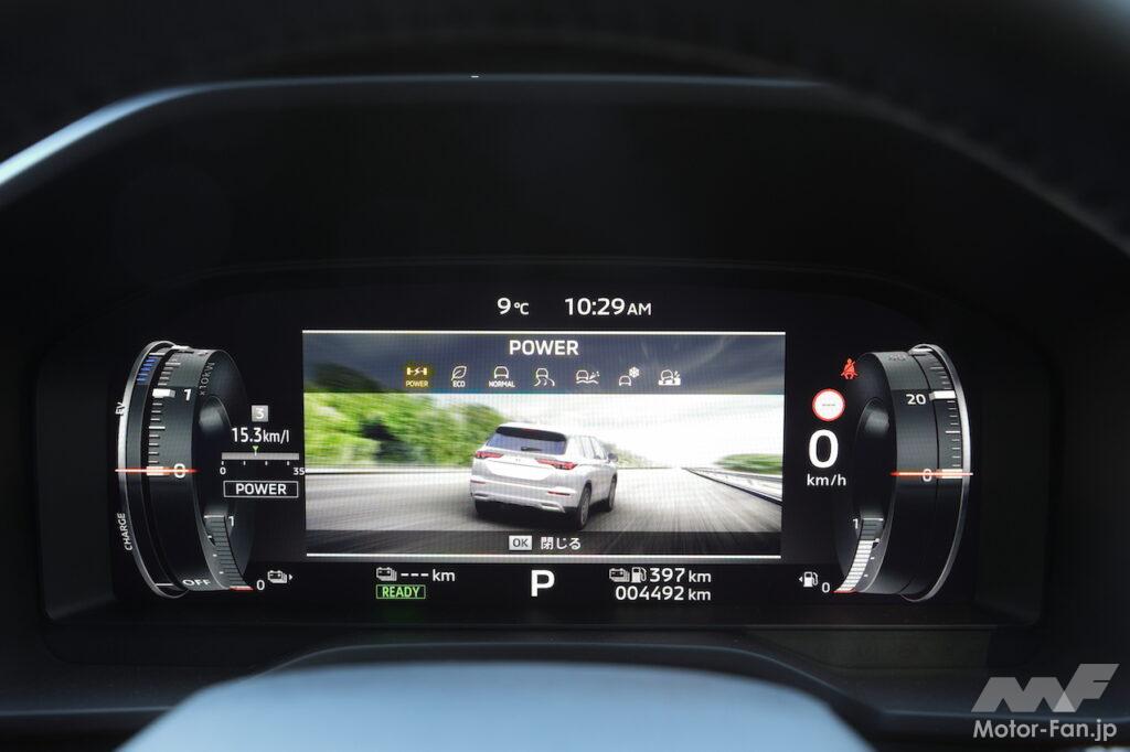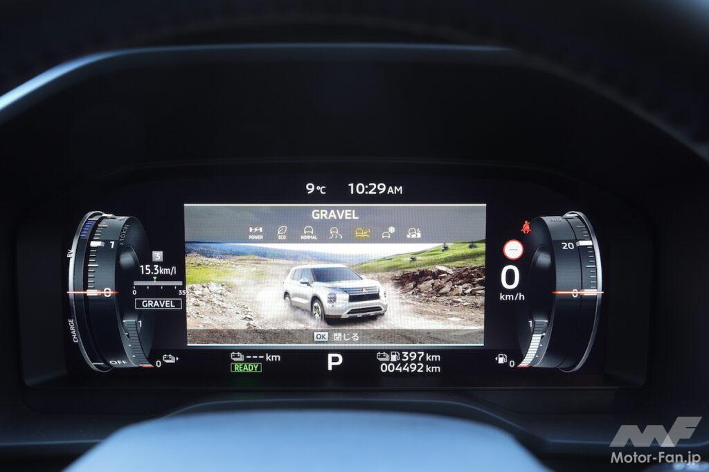 システム的には4WDでありながら通常はFFで走行し、前輪のスリップを検知したら後輪に駆動力を伝えて4WDにしたり、操舵を合図に4WDにしたりする制御が他社には見られる。燃費を重視するとそうした制御を選択したくなるが、オンオフ切り替え的な4WDにはしたくないというのが、三菱自動車の考えかただ。燃費よりも(もちろん、無視しているわけではない)、安心・安全が上位にくる。
