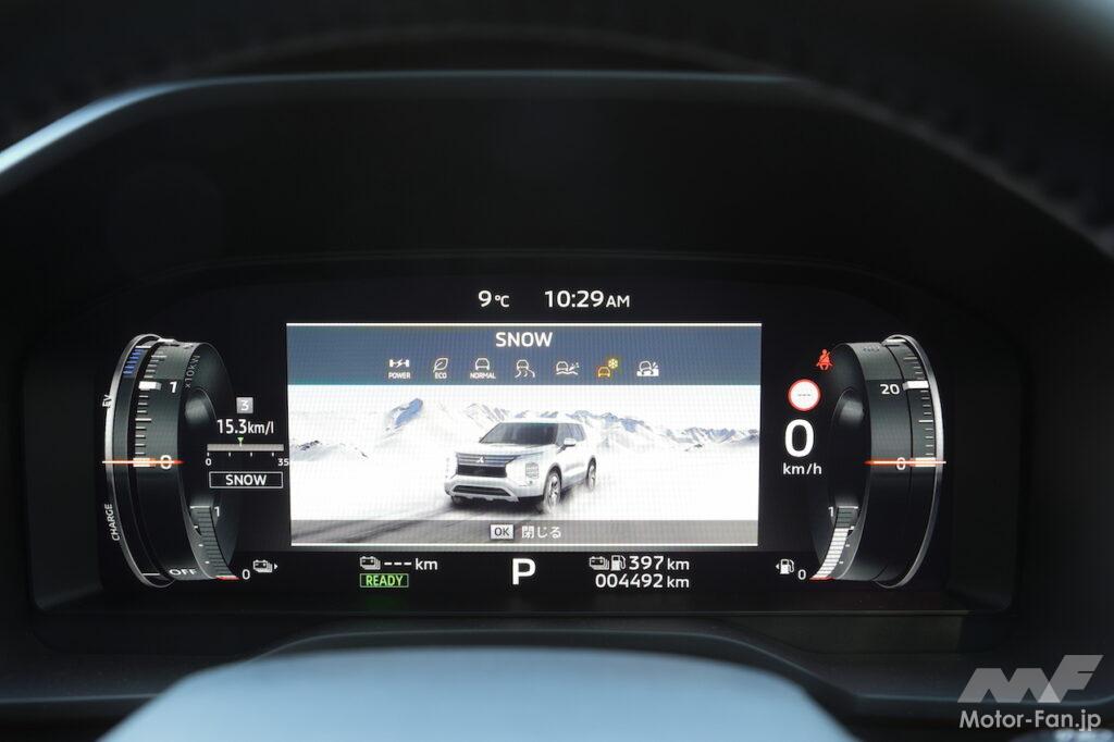 雪道でも手応えがしっかりし、常に路面状況を感じながら走れるのか。確認のため、雪道を目指して都内を出、奥会津(福島県)の峠道を目指した。澤瀬氏からは、ドライブモードを使い分けてみるようアドバイスを受けた。路面状況や運転スタイルに最適化した車両運動特性が選べる7つのドライブモードを設けているのが、アウトランダーPHEVの数ある特徴のひとつである。