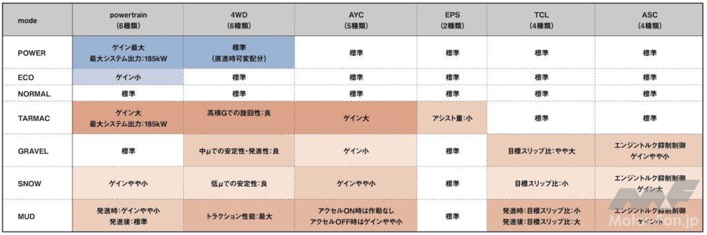 ECOはパワートレーンのゲインが小さく、ラフなアクセル操作をしても燃費良く走れるモード。POWERはモーター駆動車ならではのレスポンスの良い加速感が味わえるモードだ。「舗装路面」を意味するTARMACはAYCの利きを全モード中でもっとも高くしているのが特徴で、曲がりやすさ重視。逆に、「砂利道(未舗装路)」を意味するGRAVELはAYCの利きを弱くし、前後どちらかが滑ったら反対側に再配分する4WDはトラクション重視の設定。「泥」を意味するMUDは泥濘路での走りを想定しているので、トラクション重視が明確。アクセルオン時の旋回補正はまったく行なっていないのが特徴だ。
