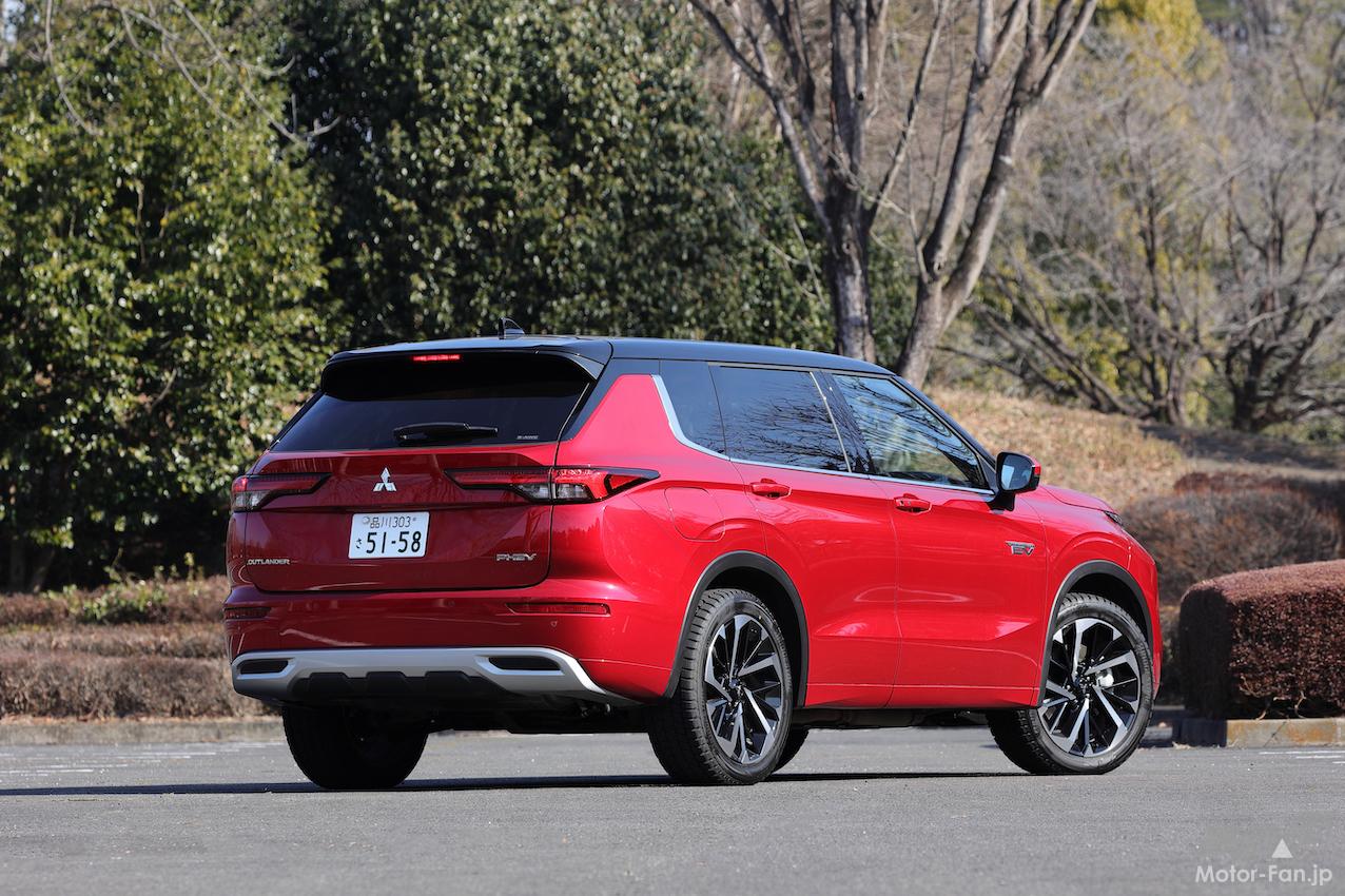 フロントとリヤに高出力のモーターを搭載した「ツインモーター4WD」なのもアウトランダーPHEVの大きな特徴。床下に搭載するリチウムイオンバッテリーの総電力量は20kWhで、電気自動車のeKクロスEVと同じである。つまり大容量。そのため、充分なEV航続距離(WLTCモードのEV走行換算距離で83〜87km)を確保している。