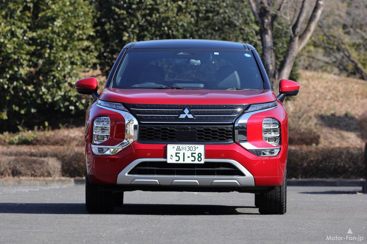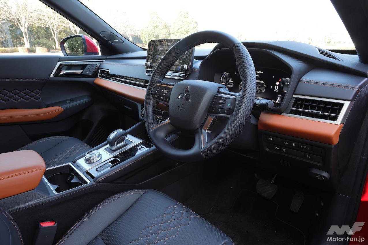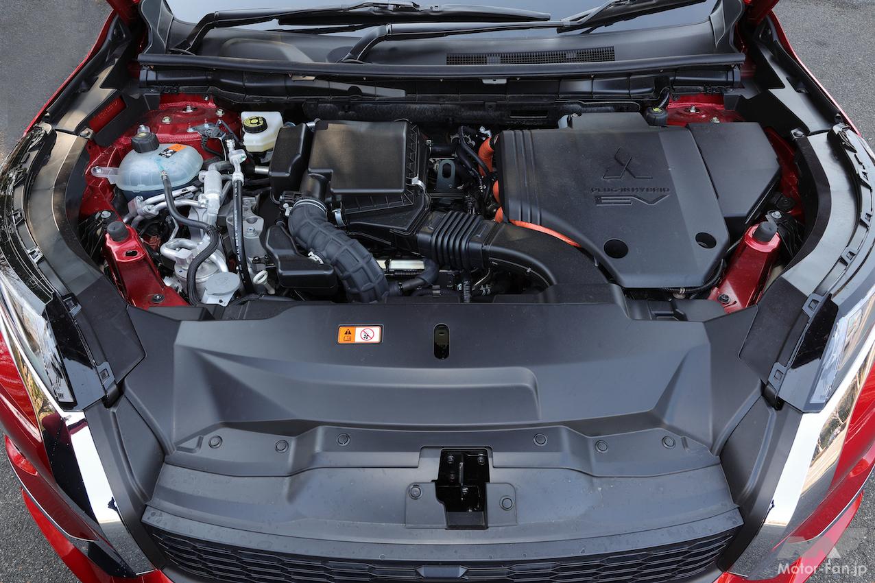 横置き(左右方向)に搭載する2.4L直列4気筒自然吸気エンジンの横に搭載するフロントモーターの最高出力は85kW、最大トルクは255Nmだ。リヤモーターの最高出力は100kW、最大トルクは195Nmである。昨今、リヤに高出力モーターを搭載する電気式4WDが増えているが、高出力といえどもアウトランダーPHEVほど高出力ではなく、フロントに搭載するパワーユニットのほうが高出力なのが一般的だ。