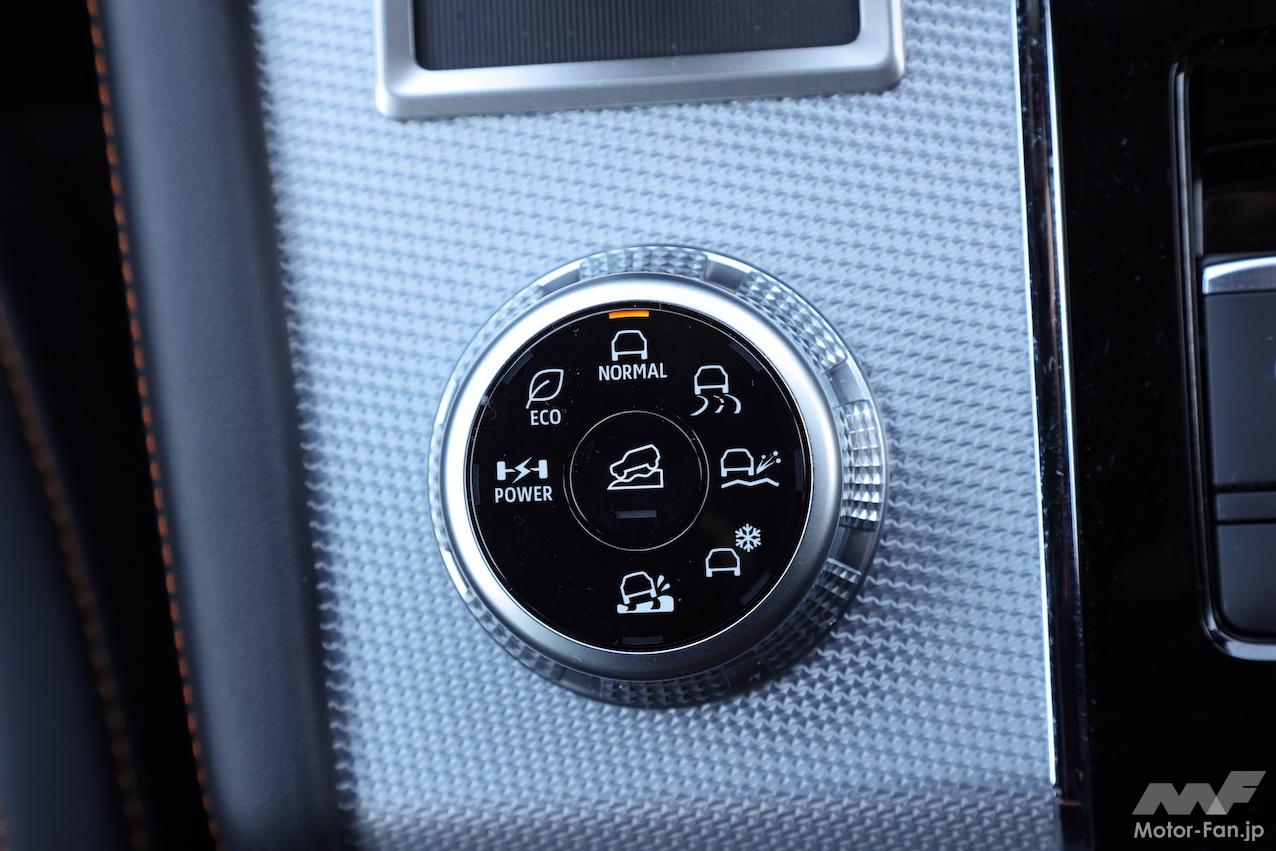ドライブモードセレクターはフロアコンソールに設置されている。時計の12時の位置にあるNORMAL(ノーマル)が通常使用するモード。左側(9時〜11時)には運転スタイルに合わせて選ぶECO(エコ)とPOWER(パワー)が配置されており、アクセル操作に対するパワーの出方の勾配が変わる。右側(1時〜6時)には路面状況に合わせて選ぶTARMAC(ターマック)、GRAVEL(グラベル)、SNOW(スノー)、MUD(マッド)が配置されている。