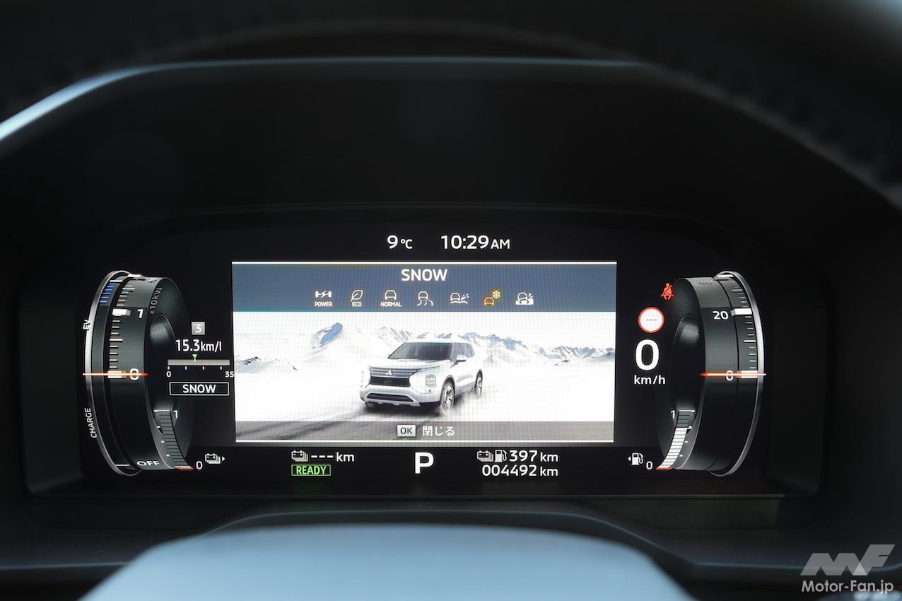 雪道でも手応えがしっかりし、常に路面状況を感じながら走れるのか。確認のため、雪道を目指して都内を出、奥会津(福島県)の峠道を目指した。澤瀬氏からは、ドライブモードを使い分けてみるようアドバイスを受けた。路面状況や運転スタイルに最適化した車両運動特性が選べる7つのドライブモードを設けているのが、アウトランダーPHEVの数ある特徴のひとつである。