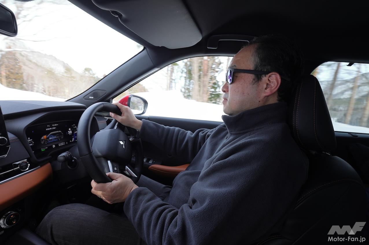 「グリップ領域からツルッと滑っていきそうな状況で走っている際に、ハンドル操作に対して気持ち良くクルマの向きが変わるのはスノーモードが一番だと思います。(メカニカルな機構で駆動力を伝達していた)かつての前後駆動力配分は、加速や減速が強い領域でないと、挙動の改善効果はあまりないというのが通説でした。ツインモーター4WDは加速や減速が弱い日常領域においても理想前後駆動力配分による中立付近のしっかり感や、そこからスッと曲がる際の曲がりやすさでもきちんと差が出ます」