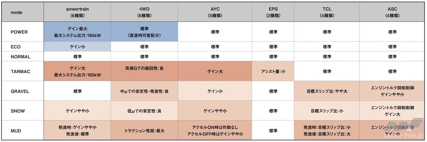 ECOはパワートレーンのゲインが小さく、ラフなアクセル操作をしても燃費良く走れるモード。POWERはモーター駆動車ならではのレスポンスの良い加速感が味わえるモードだ。「舗装路面」を意味するTARMACはAYCの利きを全モード中でもっとも高くしているのが特徴で、曲がりやすさ重視。逆に、「砂利道(未舗装路)」を意味するGRAVELはAYCの利きを弱くし、前後どちらかが滑ったら反対側に再配分する4WDはトラクション重視の設定。「泥」を意味するMUDは泥濘路での走りを想定しているので、トラクション重視が明確。アクセルオン時の旋回補正はまったく行なっていないのが特徴だ。