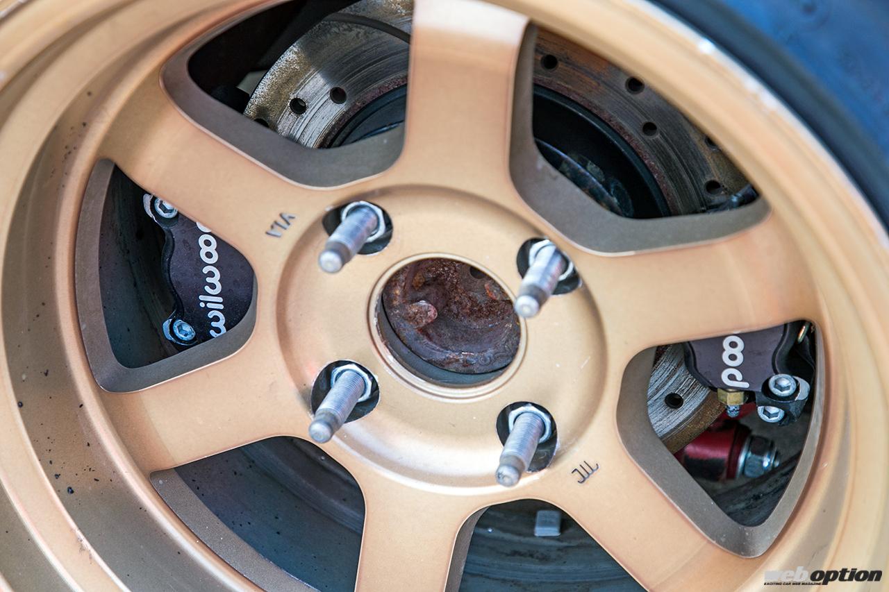 ブレーキはフロントにFC3S純正。リヤはウィルウッド製のキャリパーを追加してツインキャリパー化されている。