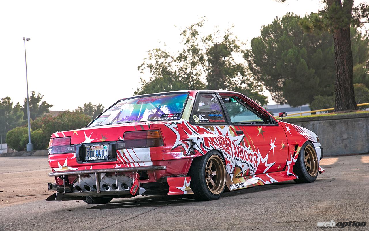 一方のAE86はというと、こちらもエクステリアのメタルワークやテクノ・トイ・チューニング製パーツを使ったサスペンションの改造など、大半の作業をマイルズ自身が行なった。