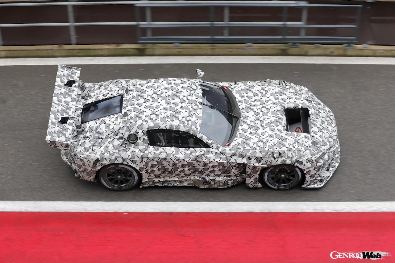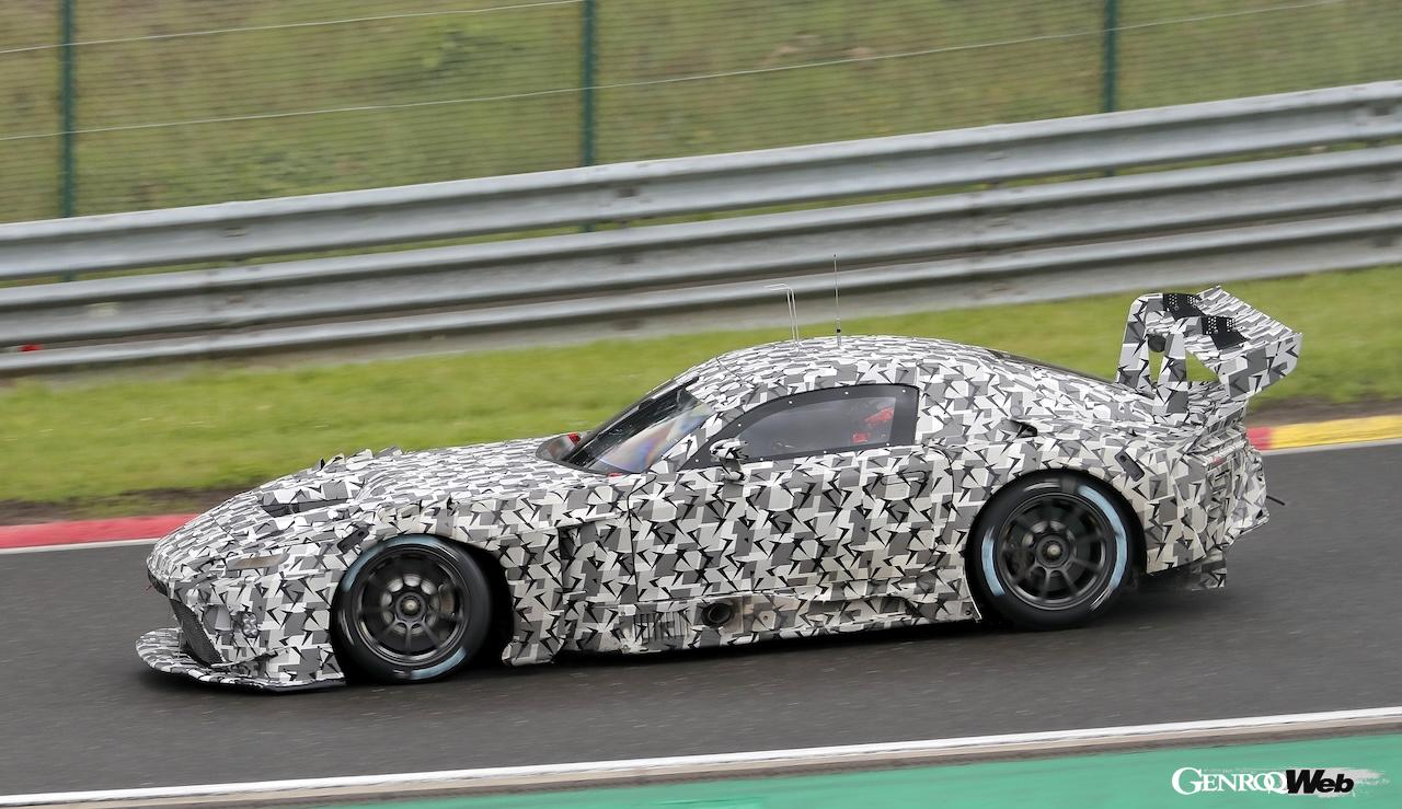ベルギーのスパ・フランコルシャン・サーキットで高速テストを行った「トヨタ GR GT3」のプロトタイプは、カモフラージュによってディテールを隠している。全体のイメージは「GR GT3コンセプト」からインスピレーションを得ている印象で、ボディサイズは「コンセプト」(全長4590mm、全幅2040mm、全高1140mm、ホイールベース2725mm)とほぼ同じであることがわかった。