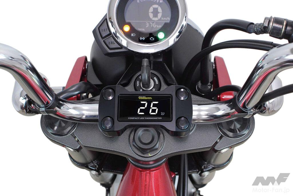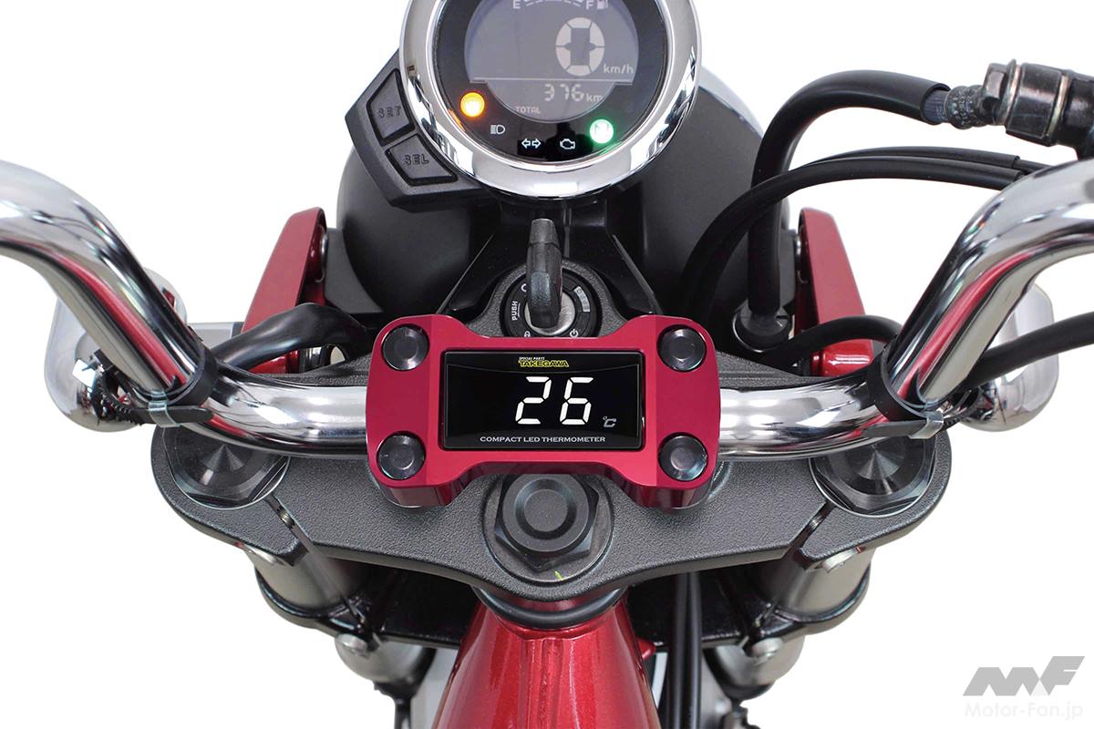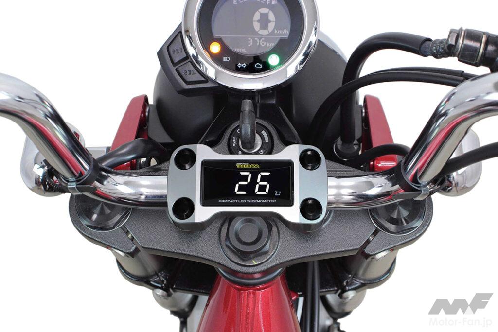 この商品はコンパクトLEDサーモメーターキットに、専用設計のビレットハンドルクランプを組み合わせた便利なキット。ハンドルクランプ内にサーモメーターを収納。これによりスピードメーターを邪魔することなくサーモメーターが収まり、ハンドル周りを美しく演出。