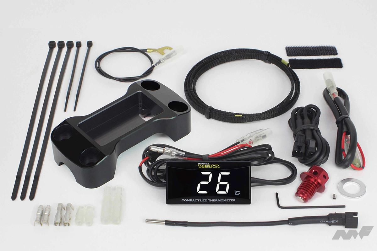 同メーターキットは配線加工の必要がないサブハーネスや、スティック温度センサー(付属)の取り付けを可能とするドレンボルトがセットになっているため、手軽にサーモメーターを装着することができる。