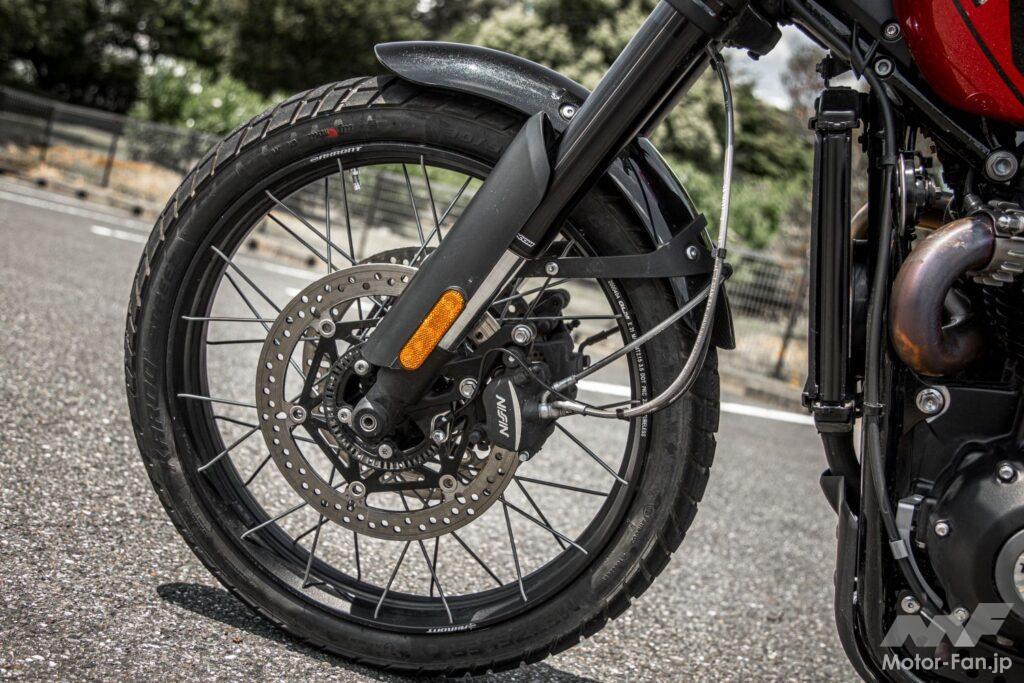丸いタンクとフラットなシート、クラシカルなルックスは本文中に記したようにかつてのストリートトラッカーを連想させてくれた。オフロードテイストを感じさせながらどこまでもオシャレ。唯一カラーリングされているタンクと個性的な21インチフロントホイールが存在感抜群だ。