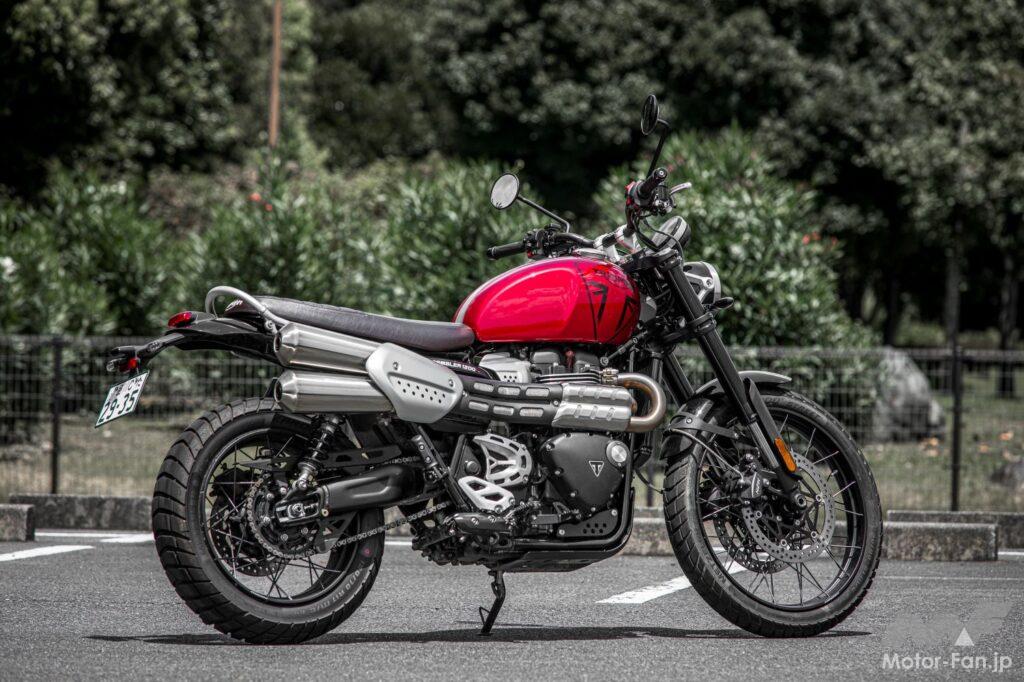 トライアンフのスクランブラーと言えば、今は出たばかりの400Xが大人気だ。日本の普通二輪免許枠で乗れ、ストリートではもちろんカッコ良くておしゃれで、しかもオンはもちろん、ある程度のオフでもマルチに楽しめる車体構成。何よりもまずは元気なエンジンが魅力的だ。