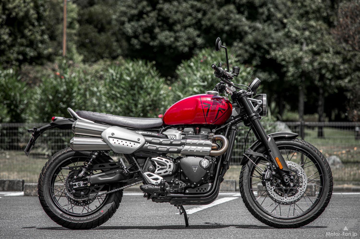 トライアンフのスクランブラーと言えば、今は出たばかりの400Xが大人気だ。日本の普通二輪免許枠で乗れ、ストリートではもちろんカッコ良くておしゃれで、しかもオンはもちろん、ある程度のオフでもマルチに楽しめる車体構成。何よりもまずは元気なエンジンが魅力的だ。