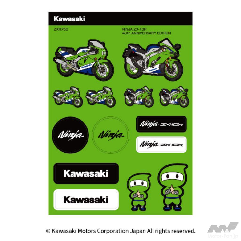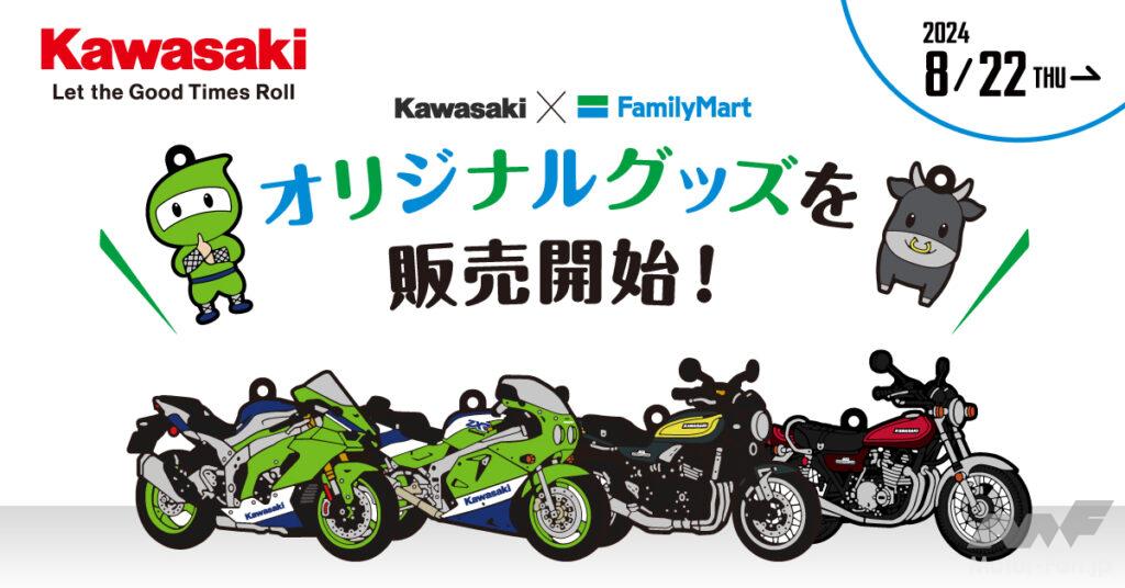 カワサキモータースジャパンとファミリーマートがコラボレート企画を展開する。カワサキチャーム付きラバーキーホルダー4種とステッカーセット2種類を店舗で販売する。キーホルダーは「ニンジャ ZX10R 40周年記念車」「ZXR750」「Z900RSイエローボール」「Z1」の4車種、ステッカーは先の「ニンジャ」2車種のセットと、「Z」2車種のセットを用意。8月22日からファミリーマートの一部店舗で先行販売を開始している。価格はキーホルダーが1430円、ステッカーが990円。