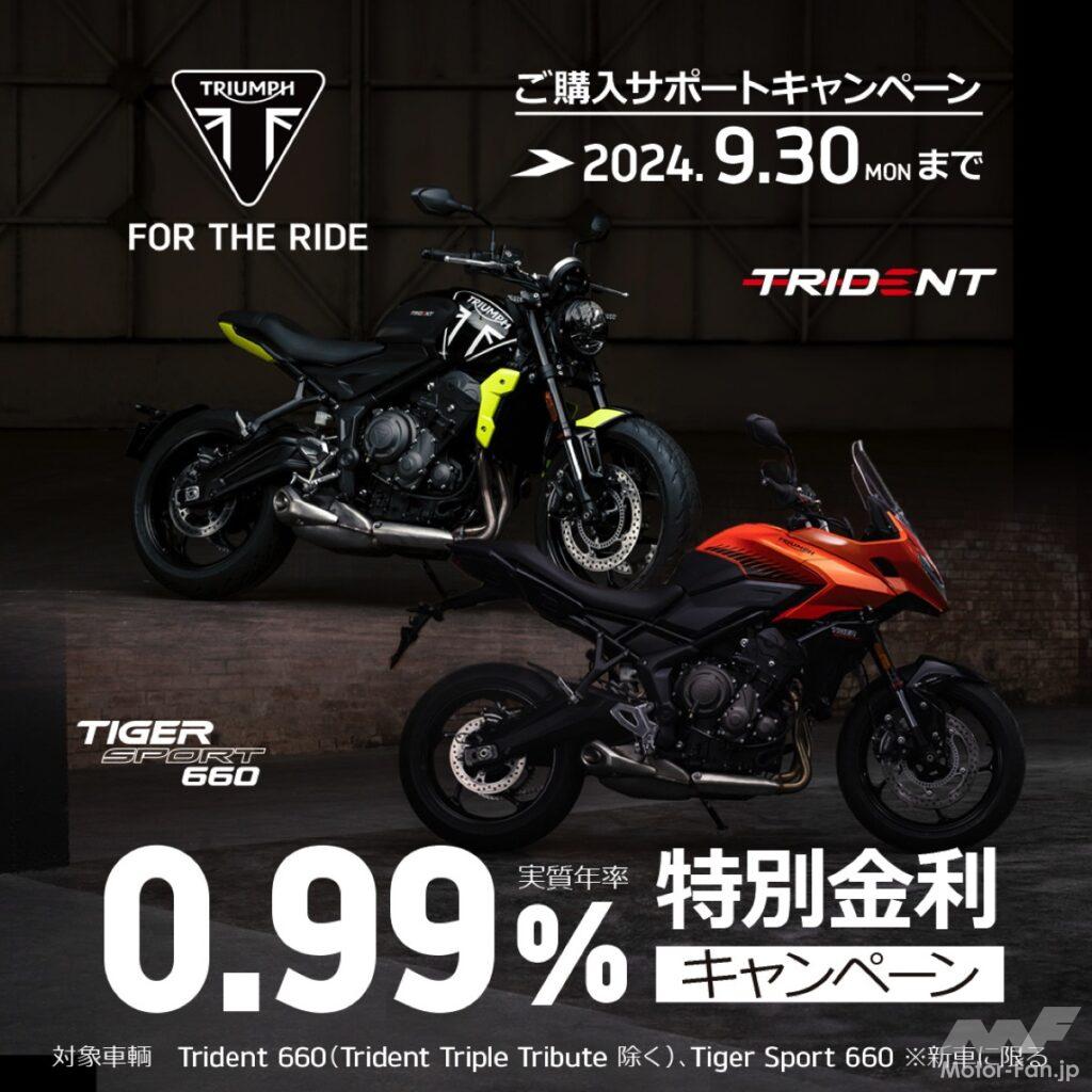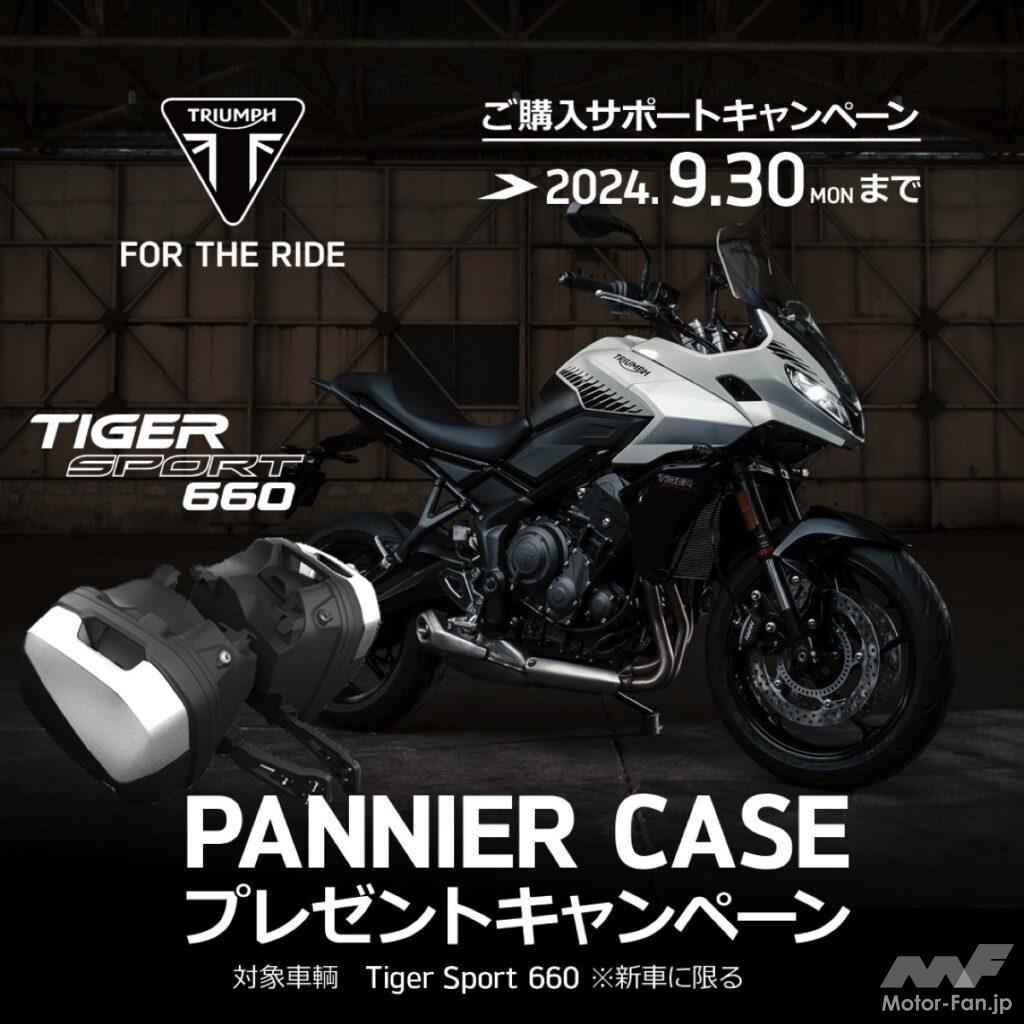 「真夏のご購入サポートキャンペーン」に追加キャンペーンが登場した。1.99%の特別低金利販売の施策の対象モデルを拡大する。目玉は「デイトナ660」の追加だ。キャンペーン中に新車を成約すると、通常はオプションの「クイックシフター」(シフトアシストとフィッティングキットのセット)をプレゼントする。期間は2024年9月30日まで。その他の車種もパニアケースやタンクバックなどが付属する。
