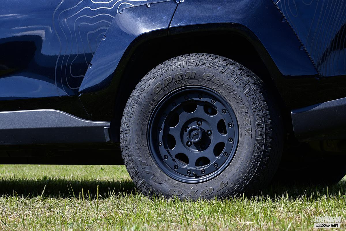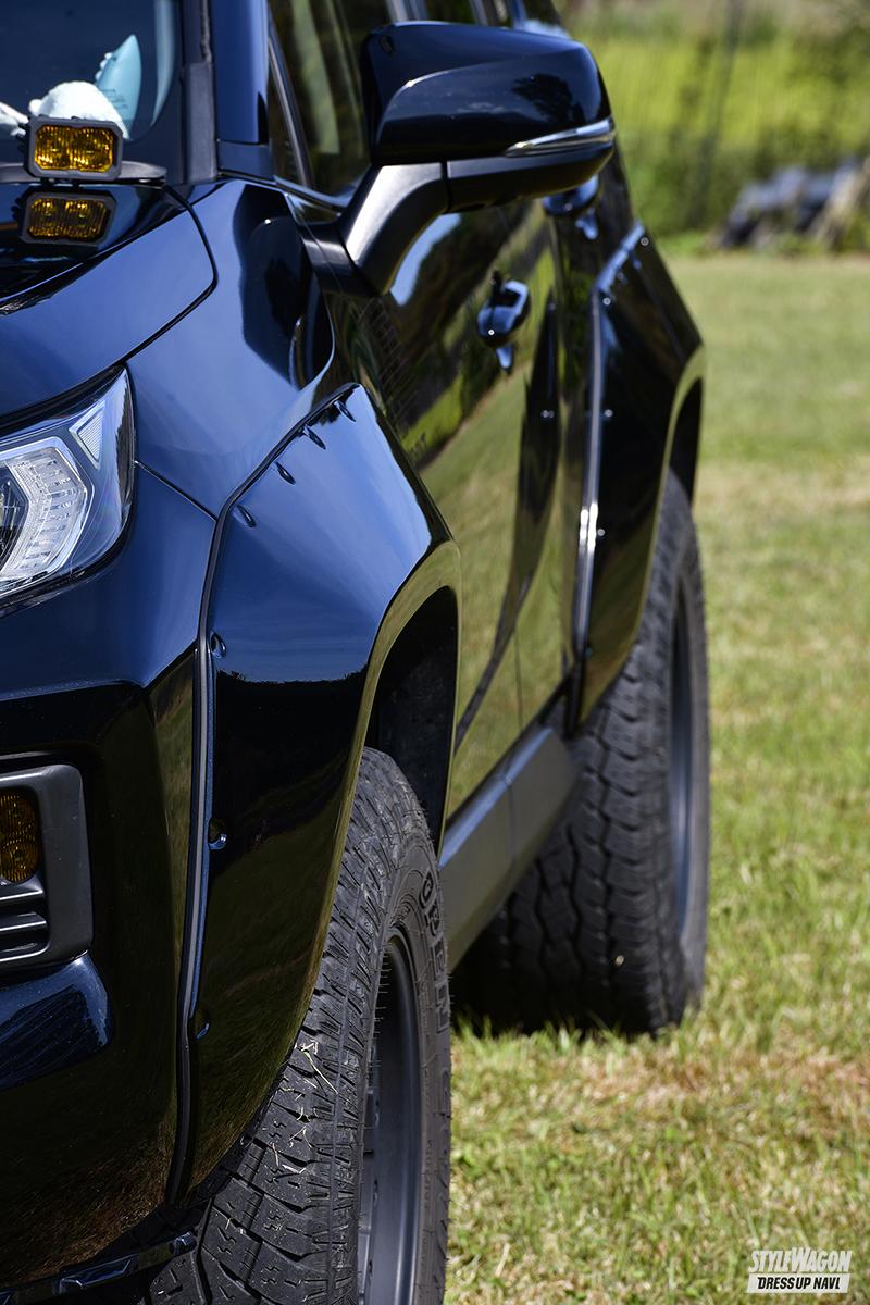 そしてオーバーランドスタイルに相応しい、力強さを感じる外装のカスタマイズにも注目したい。以前はステッカーを目立つように貼っていたが、今は黒を基調とした落ち着きのあるスタイルにシフト。タナベのアップサスでさり気なくリフトアップした足元に、マットブラックのPACERナイトホーク16インチをセットアップ。