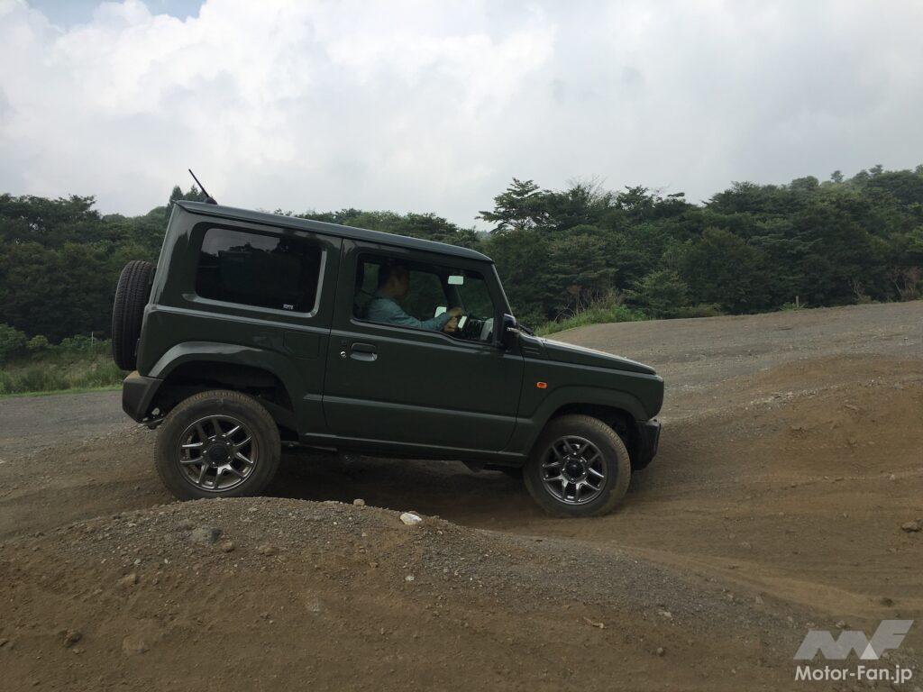 新型ジムニーは、アプローチアングル、デパーチャーアングル共に大きく取られているため、前後バンパーを擦ることもなく、楽しく走れる。こんな走りでも衝撃をしっかりと吸収し、しっかりとトラクションをかけてくれる姿はいかにもクロカン4WDという感じだ。