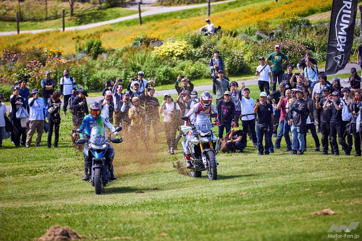 会場の富士見高原スキー場は広大な丘陵地。ここでトライアンフが誇るアドベンチャーバイク、 Tigerの性能をプロライダーに発揮してもらう予定だ。全開走行のブロックタイヤが巻き上げる芝と土を浴びながら、ド迫力のヒルクライム走行でのエギゾーストとドリフトを間近で体感しよう!